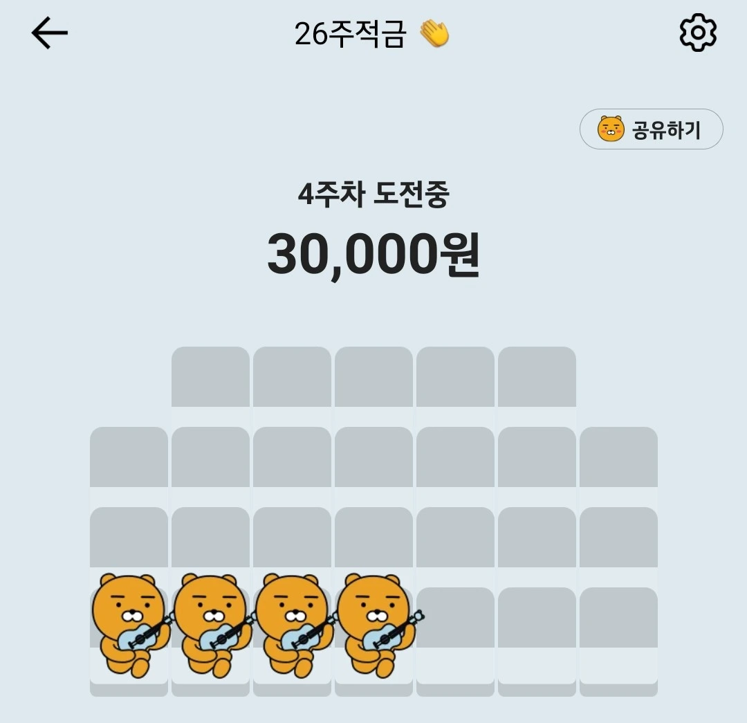 올해 한 번은 성공해 보자는 생각에 현실가능한 목표 설정으로 3천 원씩 증액으로 가입을 했다. 매주 금요일마다 증액되고 누적되는 금액을 확인하면 응원해 주는 라이언도 하나씩 늘어있다. 이번주도 잘했다고 흥겹게 기뻐해주니 천군만마를 얻은 기분이었다.