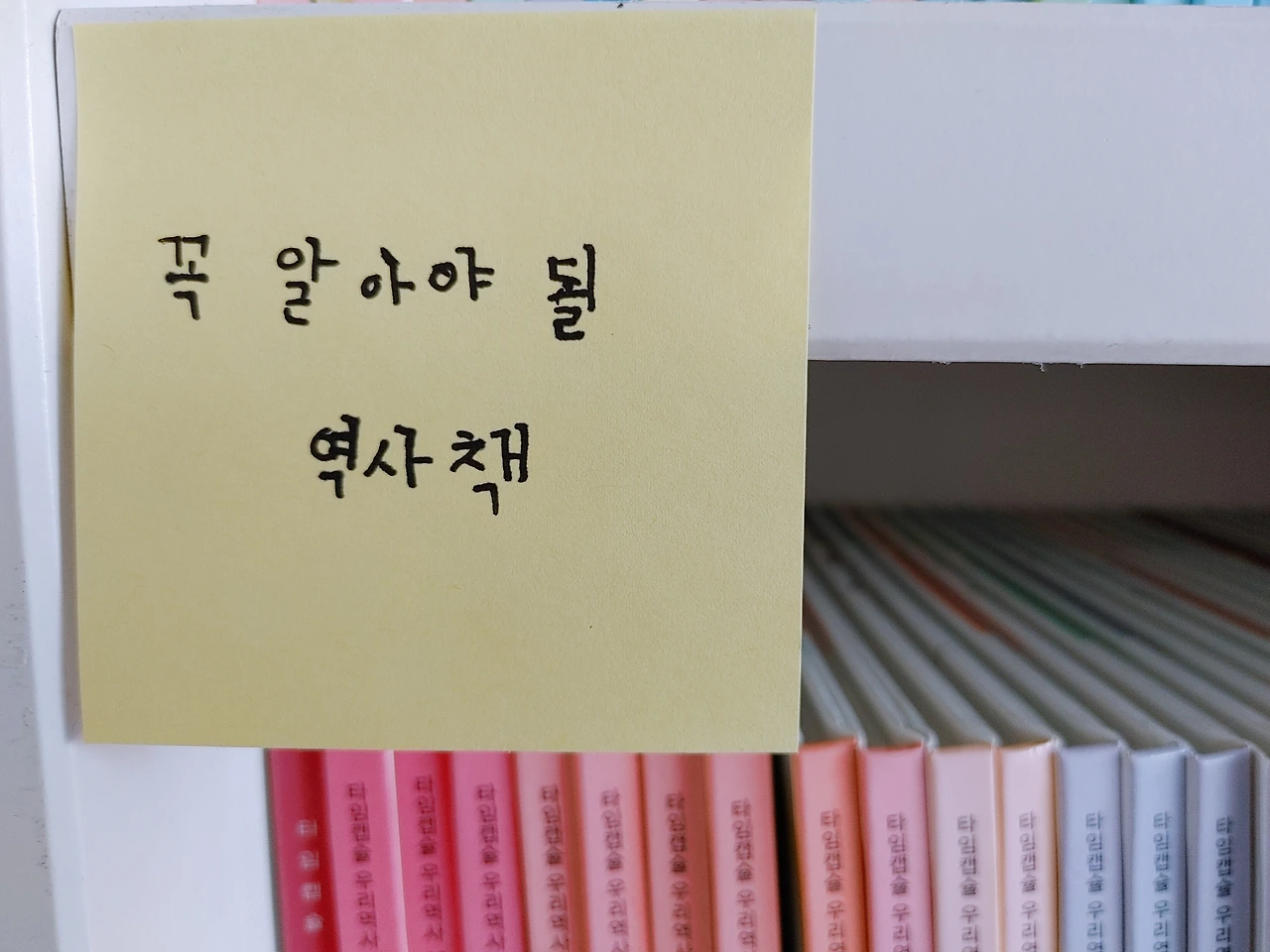 책장에는 총 6장의 책 분류표가 붙여져 있다. 재미있는 과학책, 꼭 알아야 될 역사책, 매콤하고 짭짤한 세계사책, 모든 맛이 다 있는 지식책, 또 읽고 싶어지는 문학책, 영어 쑥쑥 영어책. 6장의 포스트잍에 책 분류표를 적으며 아이는 책에 대한 느낌과 감정을 네임펜으로 꾹꾹 눌러 담아본다. 이렇게 아이랑 이야기를 나누니 아이의 취향도 책에 대한 느낌도 알아가게 된다.