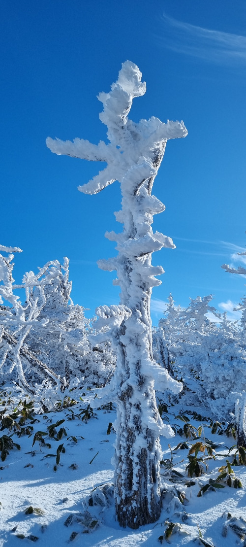 살아있는 주목은 하얀 눈에 덮여 커다란 우산 모양을 형성한다. 죽어서 나뭇가지만 남은 주목에도 흰 눈이 쌓여 하나하나가 유명 조각가의 조각품처럼 보인다.