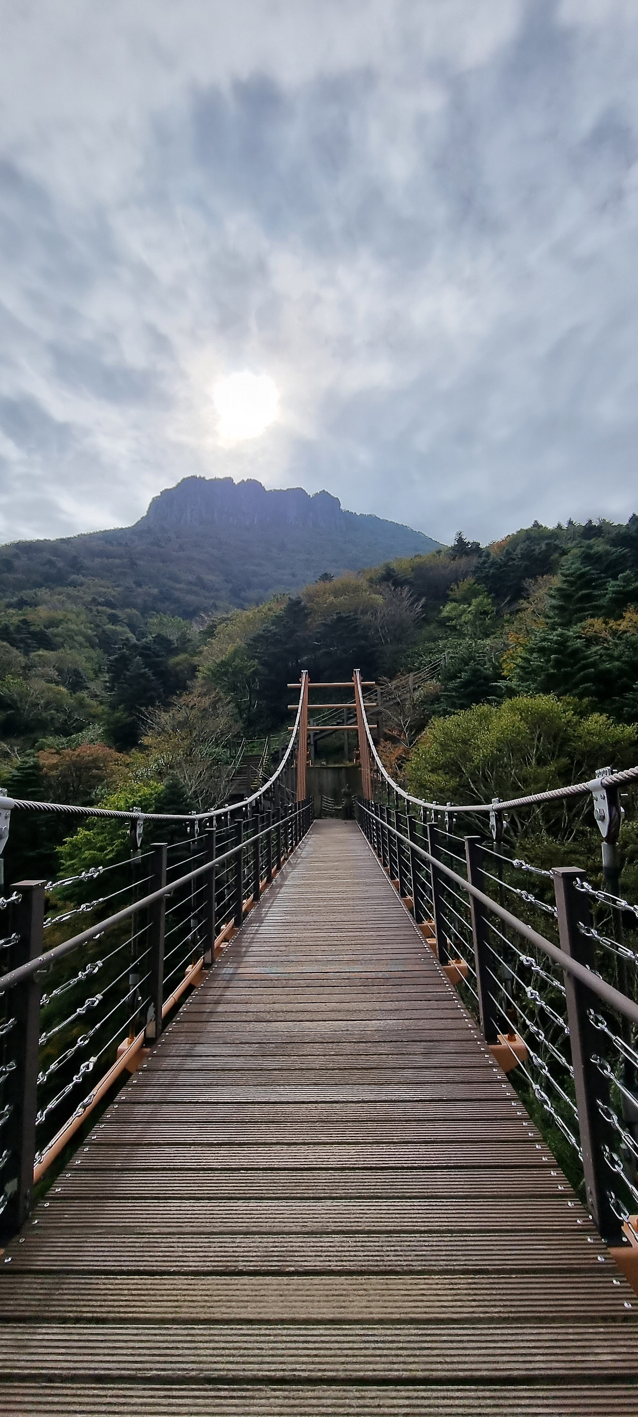 이곳 삼각봉에서 용진각 현수교와 대피소까지 이어지는 1~2km 구간은 관음사코스의 백미이다. 우측에는 웅장한 삼각봉 바위가, 좌측에는 깊은 탐라계곡이 펼쳐져 있다. 마치 초한지에서 한신이 높은 산 중턱에 잔도를 만들어 중원으로 최근 비가 많이 내려서인지 아득히 멀리 보이는 탐라계곡에서는 거친 소리를 내며 흐르는 물소리가 들린다.