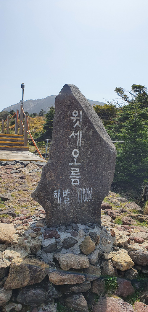 노루샘을 지나 윗세오름 휴게소에 도착했다. 많은 사람들이 휴게소의 넓은 들판에 앉아, 각자 가져온 음식과 음료를 즐기고 있다. 일부는 윗세오름이 새겨진 바윗돌 앞에서 기념사진을 찍기 위해 길게 줄을 서고 있다. 윗세오름을 지나면 왼쪽으로는 조릿대로 뒤덮인 장구목오름이 부드러운 능선을 이루며 펼쳐진다. 오른쪽에는 조릿대가 가득한 웃방애오름이 솟아 있다.