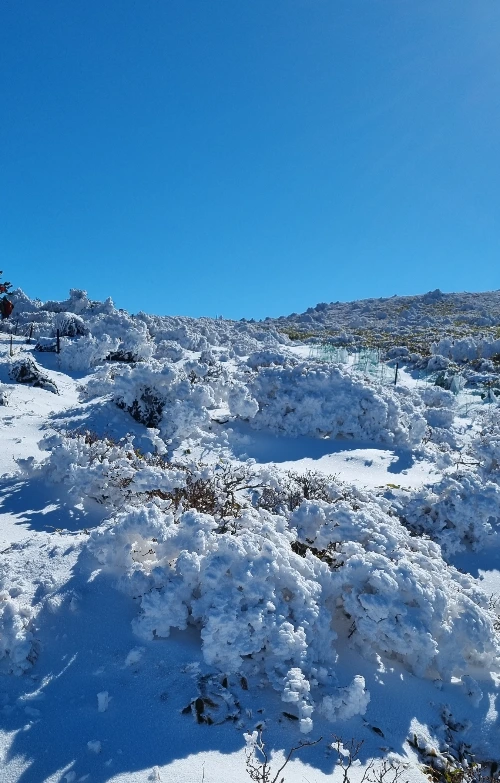 윗세오름에서 100m 정도 올라가니, 만세동산이나 사제비동산에서 볼 수 없었던 새로운 풍경이 펼쳐졌다. 등산로는 마치 눈 속의 정글에 들어왔다는 느낌을 준다. 한 치 앞도 분간하기 어려운 아프리카 정글을 떠올리게 했다. 한편으론 나무 가지가 부러질 정도로 많이 쌓인 눈이 쏟아질까 봐 불안하기까지 했다.