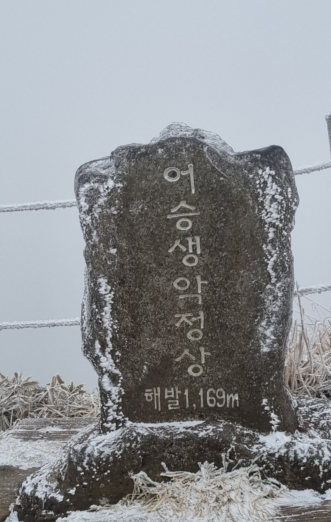 이 추위에 '어승생악 정상 해발 1,169m'라고 쓰인 표지석도 얼어있다.