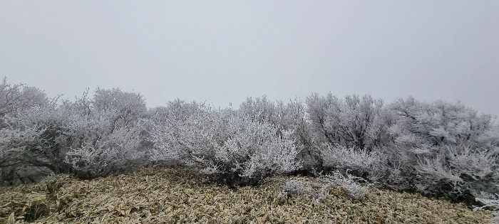 하산하는 길에 다시 한번 설경을 꼼꼼히 들여다본다. 두 번 보아도 여전히 멋있다. 하산한 후 주차장 주변의 풍경도 다시 한번 바라본다. 상고대가 가득 핀 나무들이 줄지어 있어 멋스럽다.