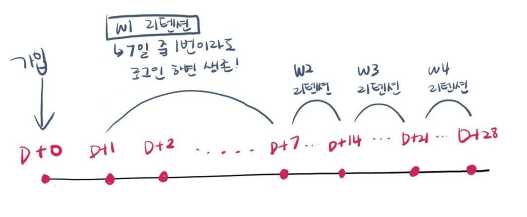 Week retention에선 일주일(=7일 동안) 1번이라도 로그인하면 생존 유저이다.