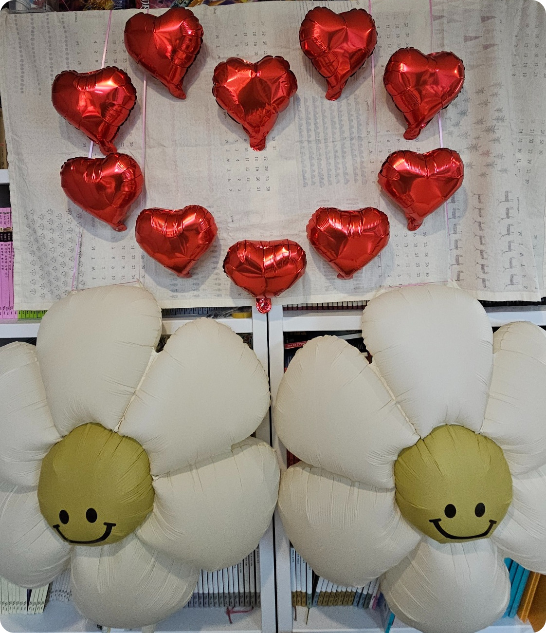 아니 풍선장식은 위에 테이프 붙이는 것만 도와주고 큰 아이가 다 붙였다. 풍선이 커서 펌프대신 입으로 불었기에 힘들어하긴 했지만 손수 장식함에 뿌듯해했다.