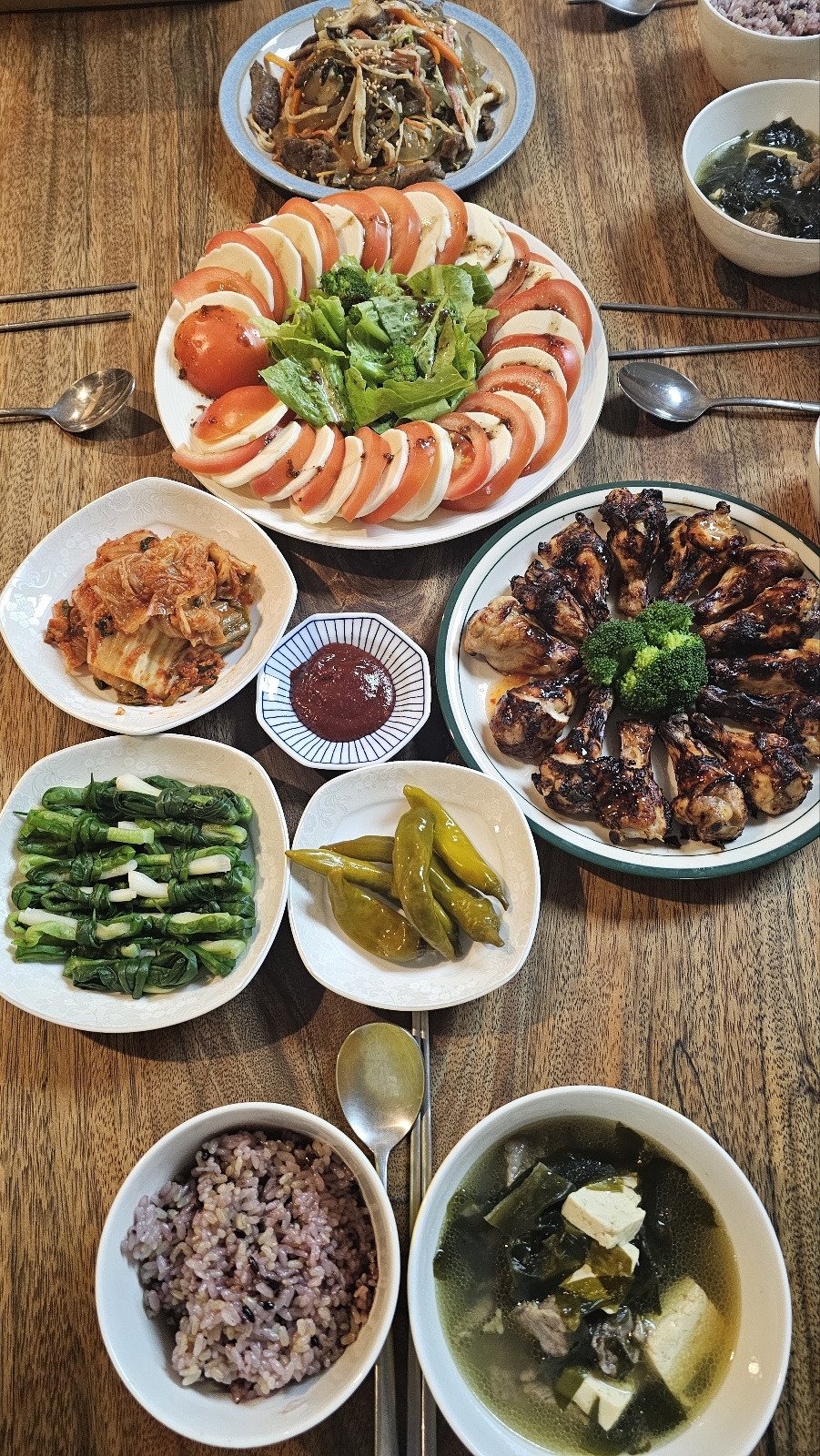 아침 일찍 닭봉구이(타긴 했지만), 토마토 카프리제, 쪽파 데침 등 오랜만에 풍성한 아침상을 차려보았다.