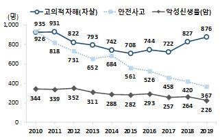 이 중에 고의적 자해(자살) 876명, 안전사고(운수사고, 추락, 익사, 화재, 중독, 기타 외인) 367명, 악성신생물(암) 226명 순으로 자살이 압도적으로 많았습니다.