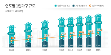 1인 가구가 급격히 증가했습니다. 2020년 인구주택 총조사 결과 1인 가구는 664만 3000가구를 넘어 전체 가구 수의 30.2%를 차지했습니다.