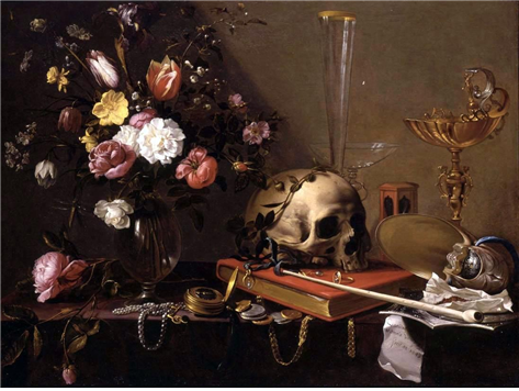이 그림에서 보듯이 왼쪽의 회중시계는 점점 다가오는 죽음을, 꽃병에 활짝 핀 꽃과 시든 꽃은 인간의 젊음이 유한함을 나타냅니다.