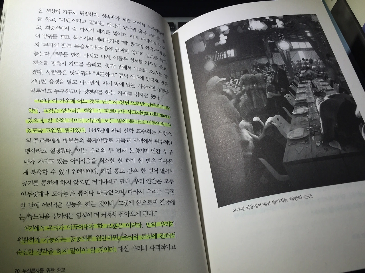 여기 새로운 쿡방(‘쿡방’이란 요리하다의 ‘Cook’과 ‘방송’이 합성한 신조어다. 단순하게 맛있게 먹기만 하는 ‘먹방’에서 벗어나 출연진들이 직접 요리하고 맛을 본다. 쿡방의 하이라이트는 보화와 같은 레시피 공개이다.)이 시작한다. 이 쿡방의 진행자와 셰프를 맡은 알랭 드 보통은 기존의 쿡방과 다른 차원의 쿡방을 보여준다. 그는 그동안 둘로 나뉜 ‘종교 쿡방’과 ‘세속 쿡방’을 넘나드는 기재(機才)를 보여준다. 그동안 ‘세속 쿡방’의 무신론자 셰프들이 무시하고 쳐다보지도 않았던(아니, 어쩌면 금기시되었던) 음식 재료, ‘종교’를 보통은 과감하게 사용하자고 한다. 그는 더 다채롭고 풍요로운 맛을 위해 편협한 ‘무신론 레시피’를 과감히 버린다. ‘맛있으면 그만 아닌가.’ ‘좋으면 된 거 아닌가.’라는 것이 그의 생각이다. 그렇다고 모든 종교의 재료를 레시피에 넣겠다는 것이 아니다. 종교 안에 있는 (무신론자들에겐) 치명적인 독소라 할 수 있는 ‘교리’를 제거하고 사용한다. 드 보통은 말한다 : 이제 새롭게 선보일 이 ‘쿡방’은 그동안 무신론자들이 외면한 풍부한 종교의 식재료들, 특히 “공동체의 도전과 관련된, 그리고 정신적이고 신체적인 고통의 도전과 관련된 통찰”을 가져다 줄 식재료들로 만들어내는 매력적인 음식들의 향연이 될 것이라고. 구체적으로 그 은식과 재료는 공동체, 친절, 교육, 자애, 비관주의, 관점, 미술, 건출, 제도이다. 자, 이제 그의 섬세한 손을 통해 공개되는 새로운 레시피를 주목하시라.