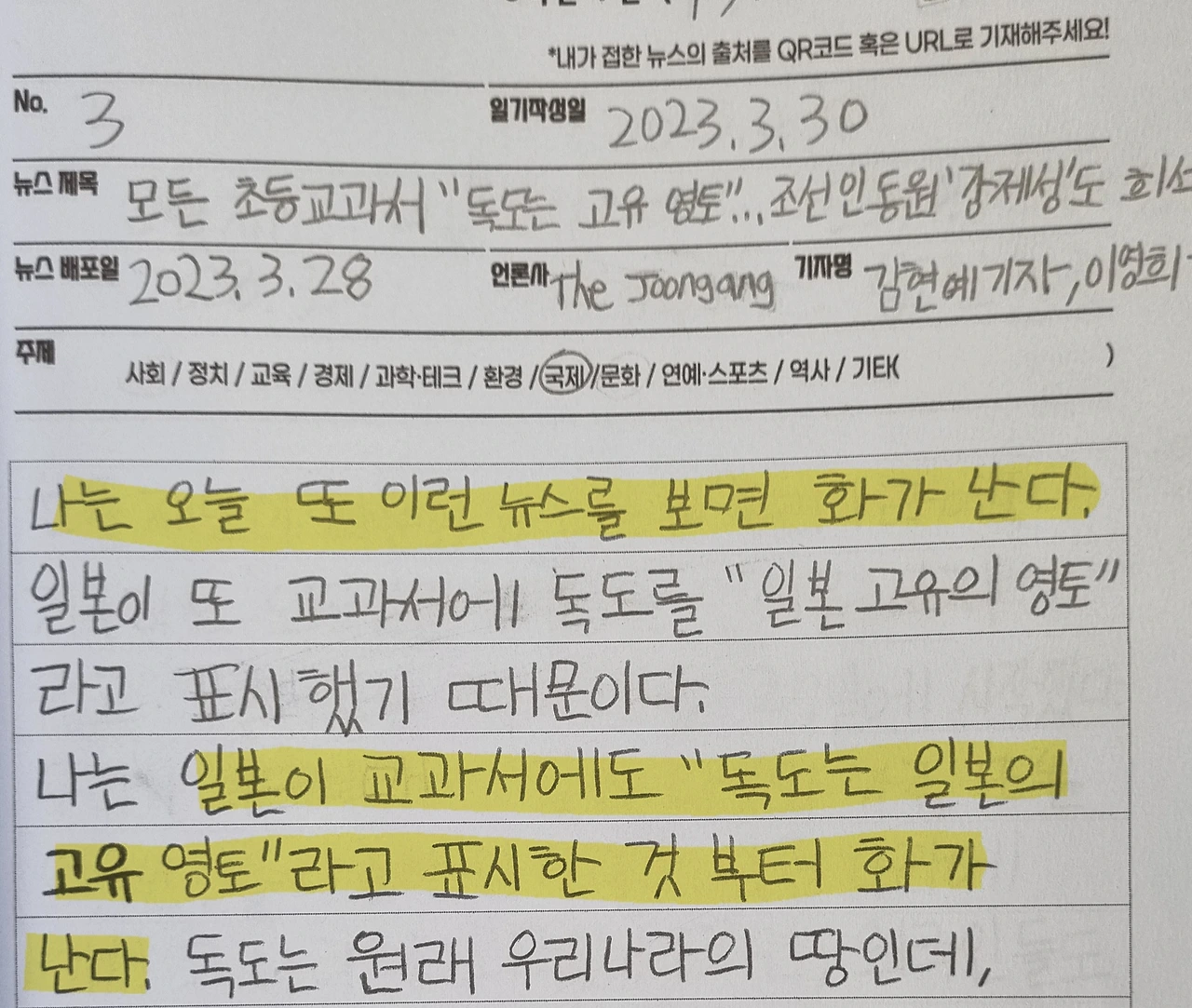 뉴스일기를 보다가 한 아이의 글이 눈에 들어왔다. 일본의 교과서와 독도에 대한 기사를 읽고 쓴 글인데 내용을 보면 화가 단단히 났음을 느낄 수 있다. 그러나 화라고는 찾아볼 수 없는 강직하고 반듯한 글자와 평소에 조용한 그의 얼굴이 내용과 대조되며 괜히 웃음이 났다. 이렇게 선비같이 대쪽 같은 '화'라니.