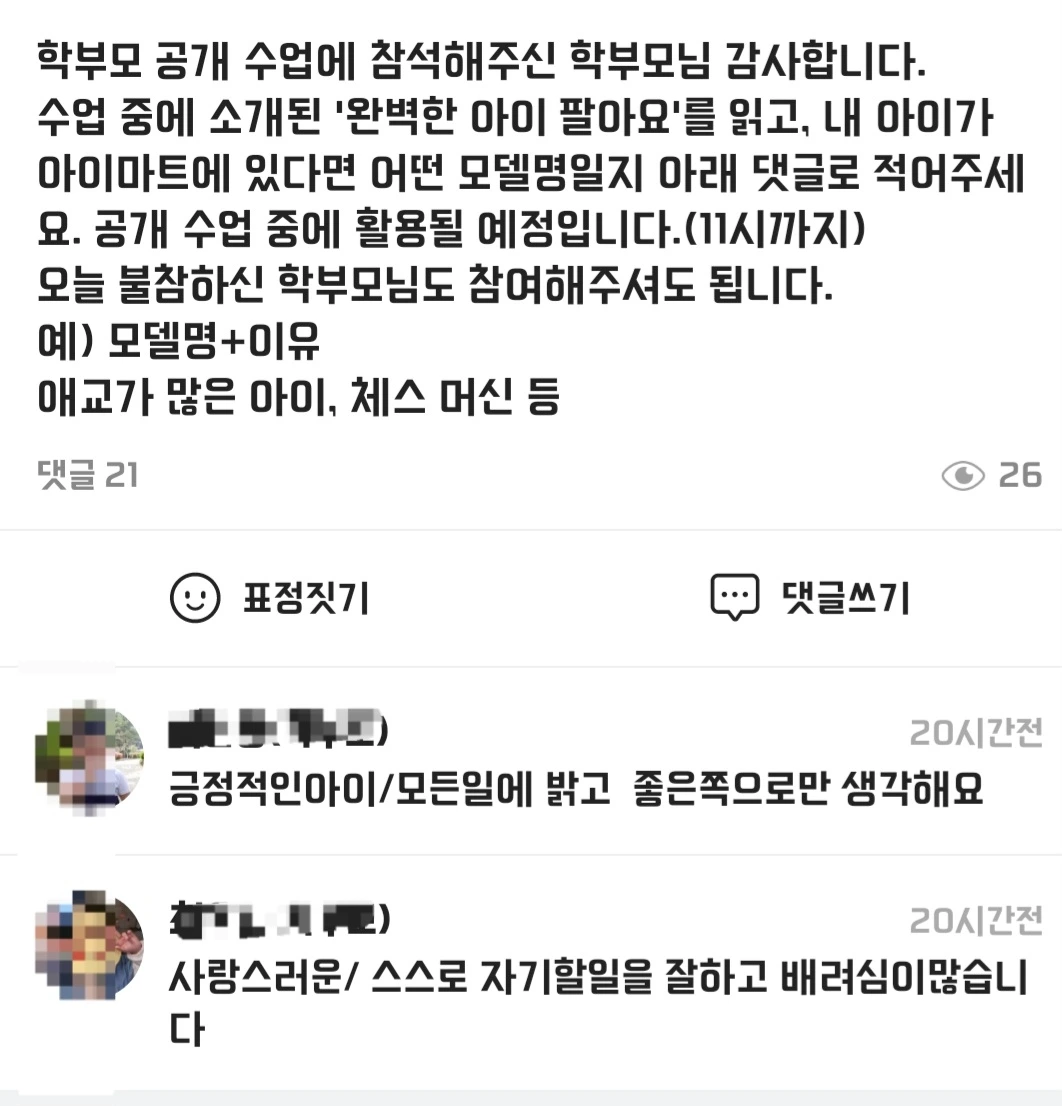 오늘 우리 반 학부모님은 바쁘셨다. 아이들 수업을 참관하러 오셨지만 수업의 일정 부분을 함께 하셨기 때문이다. 마지막 관문은 바로 내 자녀의 모델명 쓰기였다. 밴드로 공지된 글 아래에 내 자녀의 모델명이 있다면 무엇일지 이유와 함께 적어 달라 부탁을 드렸다. 그림책에 보면 아이를 파는 마트가 나오는데 아이들의 모델명이 나온다. 음악특기생, 천재 아기 같은 이름 말이다.