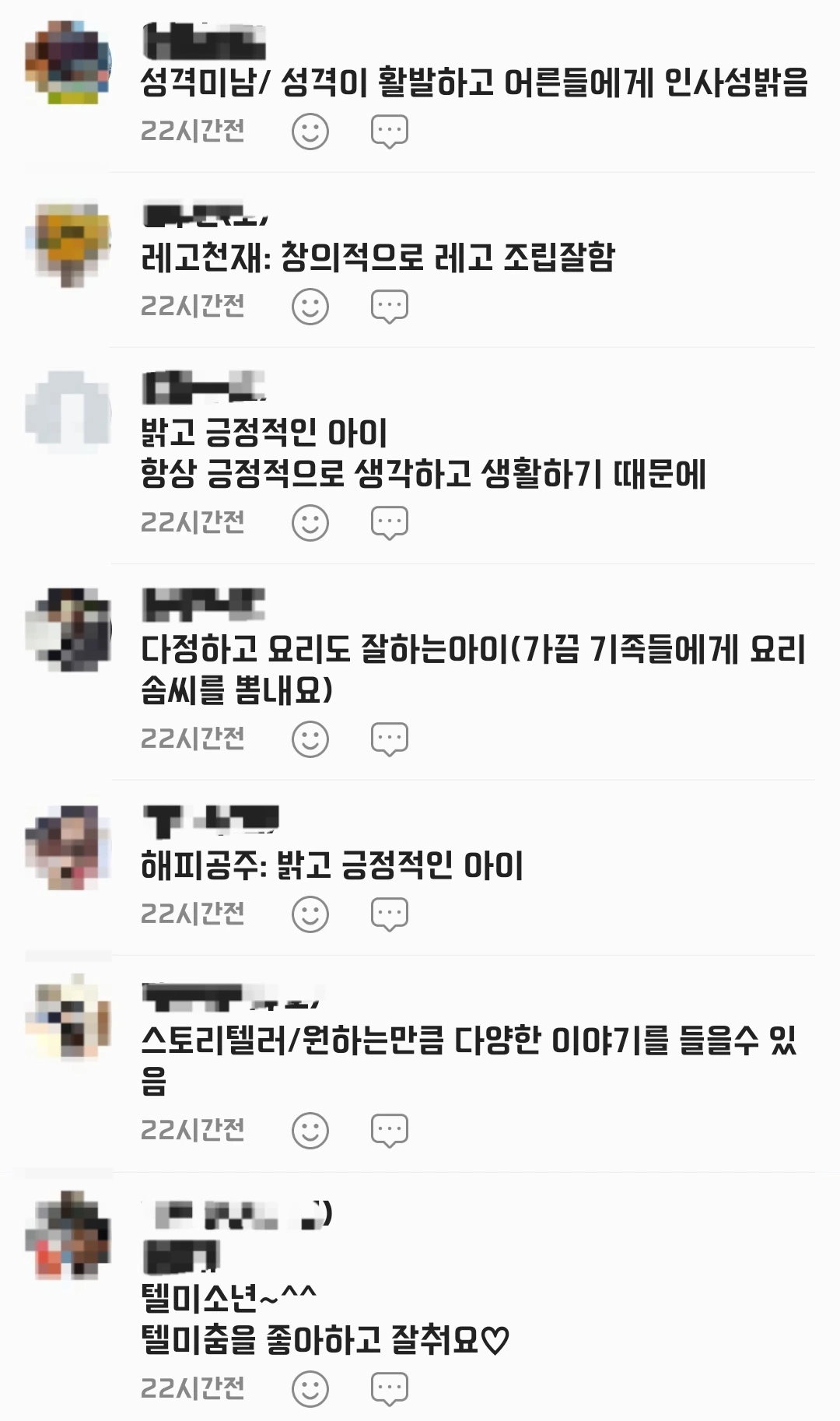 그 다음에는 댄싱머신, 긍정왕, 하고 싶은 일을 위해 하기 싫은 일도 참는 아이처럼 멋진 모델명이 등장했다. 아이들은 부모님이 자신을 이렇게 생각한다는 사실에 부끄럽기도 하고 기분이 좋은지 싱글벙글이다.