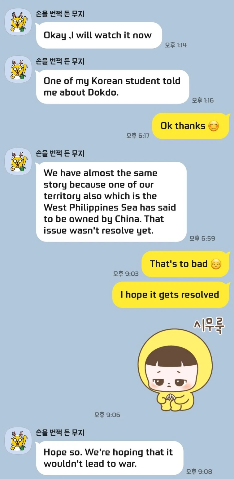 아이는 여전히 필리핀 영어 선생님과 가끔 카톡을 한다. 선생님은 태어난 아이 사진도 보내주시고, 딸은 안부도 묻는다. 엊그제는 할아버지가 보내주신 독도 영상을 필리핀 선생님한테도 보내드렸다. 번역기를 돌려서 하고 싶은 말을 야무지게 했다. 세상이 변했으니 영어를 배우는 것도 활용하는 것도 달라졌다. 귀찮아하지 않으실까 하는 우려와는 달리 답장이 왔다. 영상도 보시고, 필리핀도 중국과 영유권 전쟁을 하고 있다는 이야기도 들려주셨다.