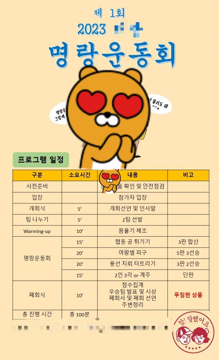 두 달 전부터 날짜를 정하고, 디데이 날에 제발 비만 오지 않게 해달라고 빌었다. 아이 7명, 어른 8명이 참가하는 제법 규모가 있는 운동회였다. 사회와 진행을 맡은 아빠는 운동회의 기분을 업시켜줄 진행표까지 만들어 카톡으로 뿌렸다.