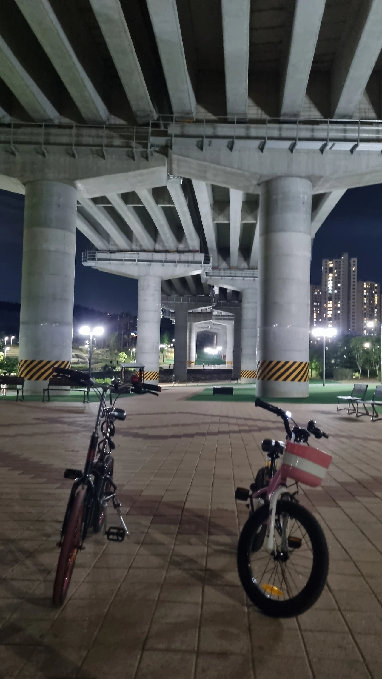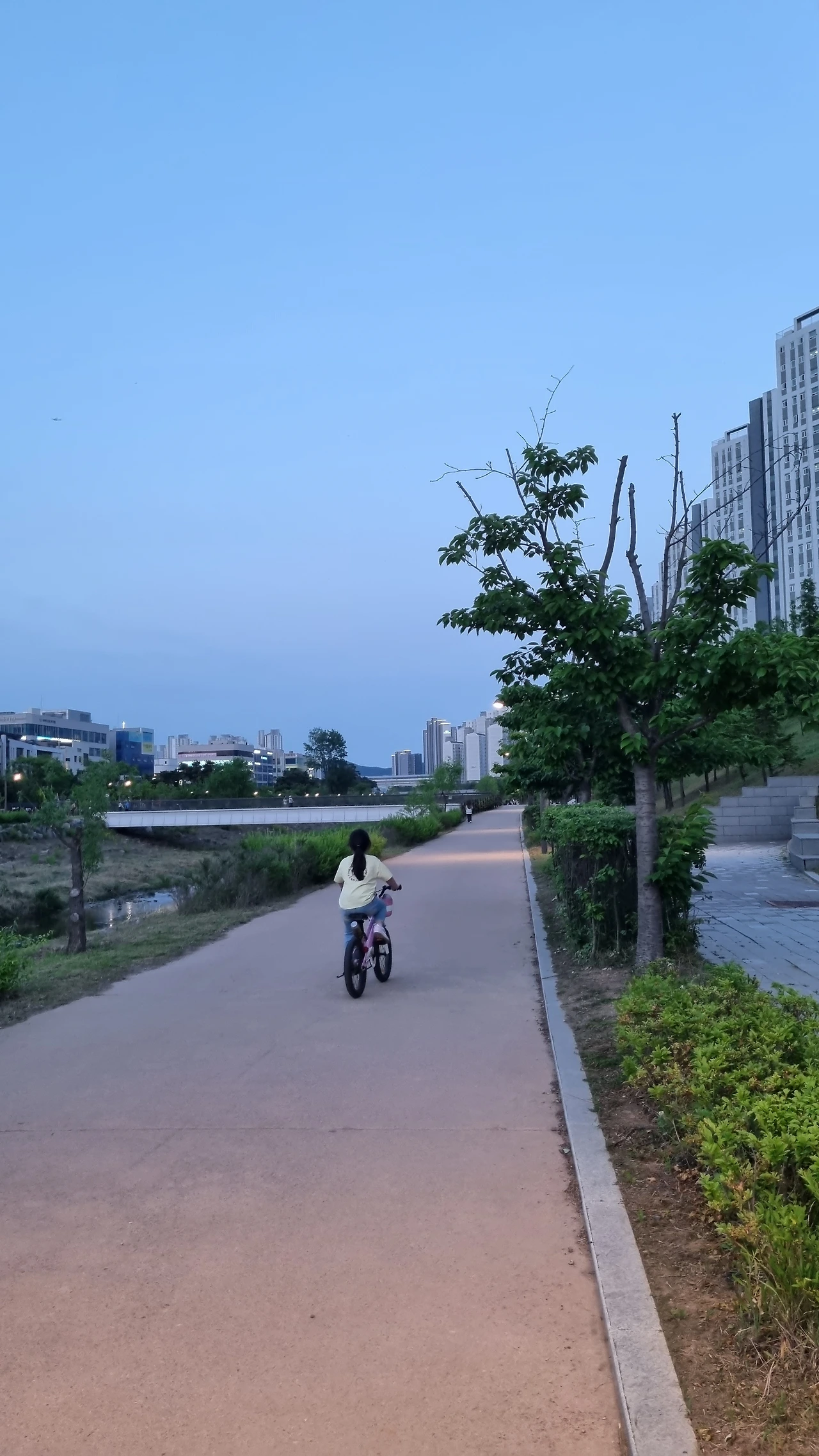 집에 들어오자마자 빨리 저녁을 먹고 아파트가 아닌 곳에서 엄마랑 자전거를 탈 것이라고 말하니 요즘 자전거 타기에 푹 빠진 딸이 좋다고 응답했다. 집에 자전거가 2대(아이용 1, 어른용 1)인지라 마침 수영을 다니는 아빠는 다음에 함께 타기로 했다. 저녁을 얼른 먹고 치우고선 작은 가방에 물, 바람막이 점퍼, 이어폰, 물티슈, 밴드를 넣어 집을 나섰다.