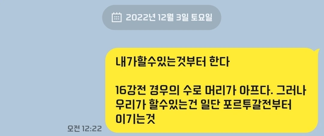 열렬히 응원해마지 않던 2002년 월드컵 레퍼토리가 지겨워질 때쯤(사실 하나도 안 지겹다) 또다시 20년은 우려먹을 수 있는 2022년의 대 역전극 장면이 눈앞에 벌어졌다.