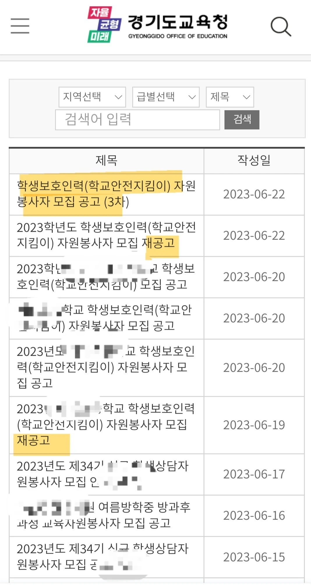 현재 경기도교육청 모집 공고를 보아도 재공고, 3차 공고도 쉽게 눈에 띈다. 이것뿐만이 아니다. 학생 등하교 시 교통안전지도를 하다 보니 주차장 차량 통제시에 학부모로부터 막말을 듣고 그만두시는 경우도 많다. 근무지에서도 하교 시간에 장애인 주차구역에 주차를 하고 아이를 기다리는 학부모에게 차를 빼달라고 하자 학교안전지킴에게 심한 말을 하시고는 기분이 안 풀렸는지 교무실로 항의 전화까지 한 경우도 있다. 도대체 누구 잘못인지 정녕 모르는 걸까? 사뭇 궁금해진다.