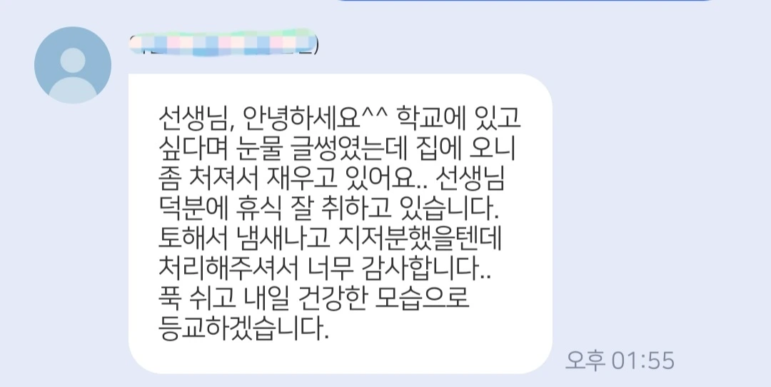 아침부터 정신없는 하루를 보내고 아이들이 모두 하교하고 나서야 학부모에게 아이의 상태를 묻는다.