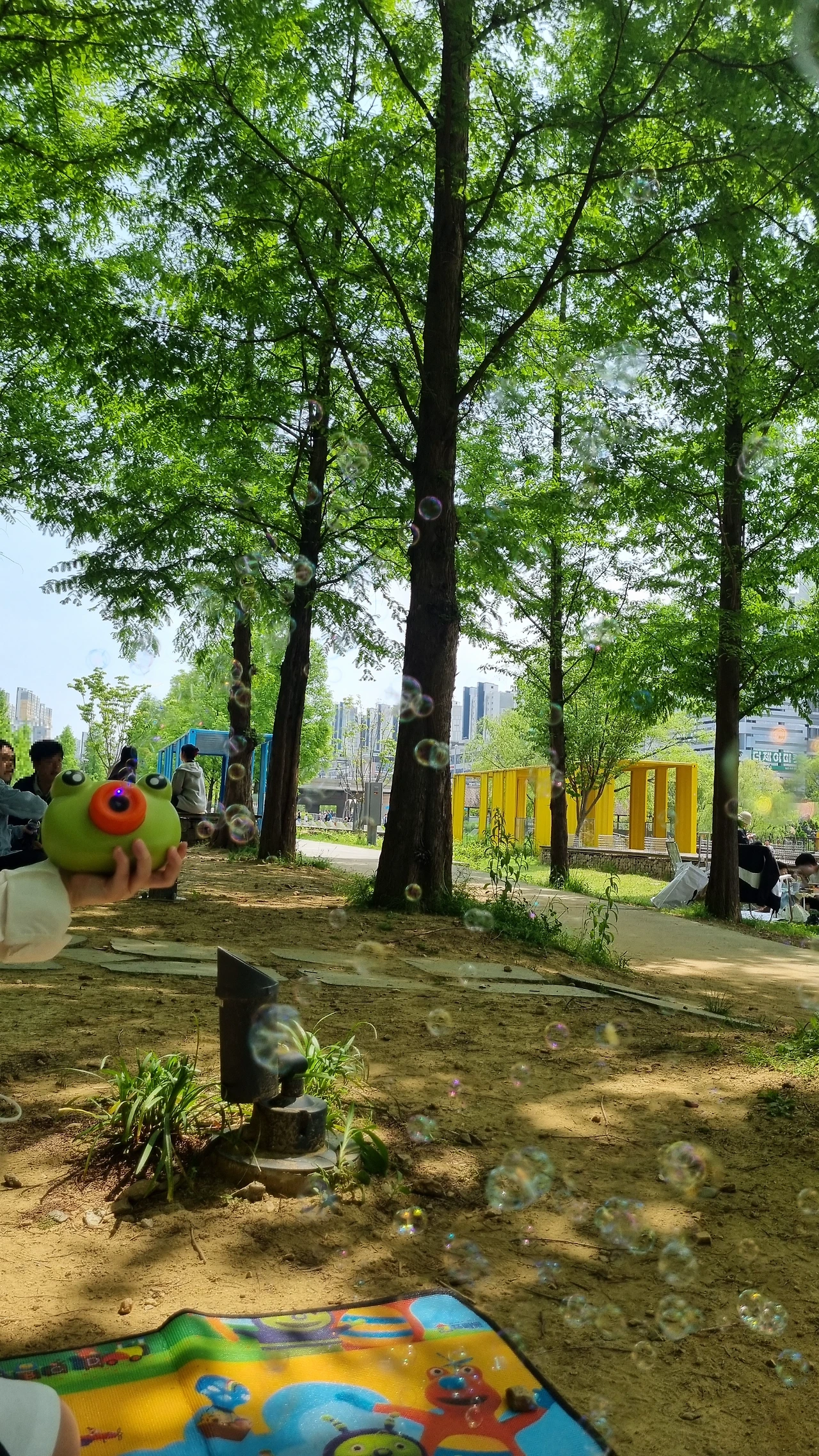 화창한 주말, 아이와 근처 공원에 돗자리를 펴고 앉아 시간을 보냈다. 날씨가 좋아 오랜만에 아이 때 감성을 불러일으키는 비눗방울도 챙겼다.