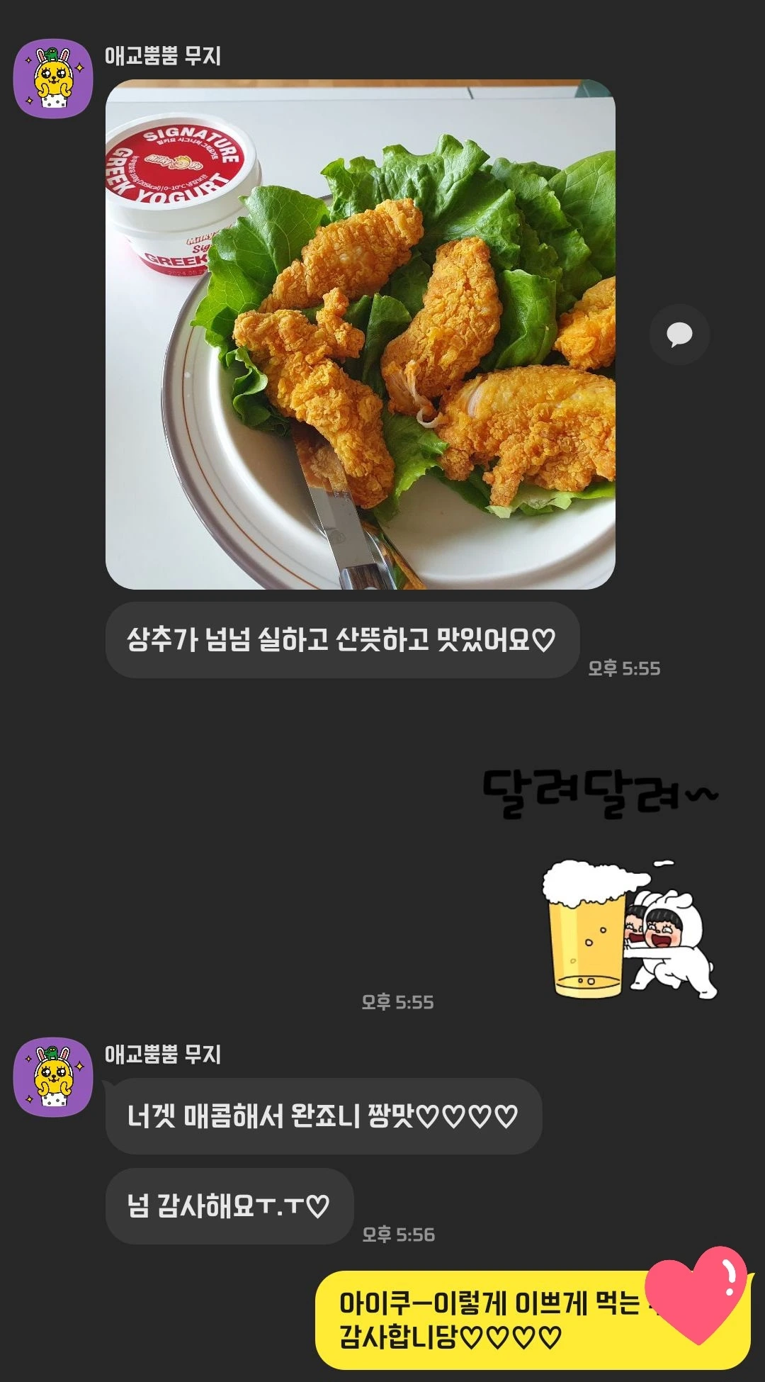몇 시간 후 이른 저녁시간에 카톡에 사진 한 장이 전송되었다. 예쁜 그릇에 연둣빛 상추와 치킨텐더가 담긴 사진이었다. 몇 천 원이면 사고 남을 상추를 받고서 플레이팅까지 해서 맛있게 먹고 후기까지 남겨주는 다정함에 또다시 입꼬리가 승천이다. 맥주가 빠진 것이 보는 내가 아쉽지만 산뜻하고 맛있다니 기분이 좋다. A는 상추를 줘서 고맙다지만 나는 이렇게 예쁘게 먹어주는 모습에 더 고맙다.
