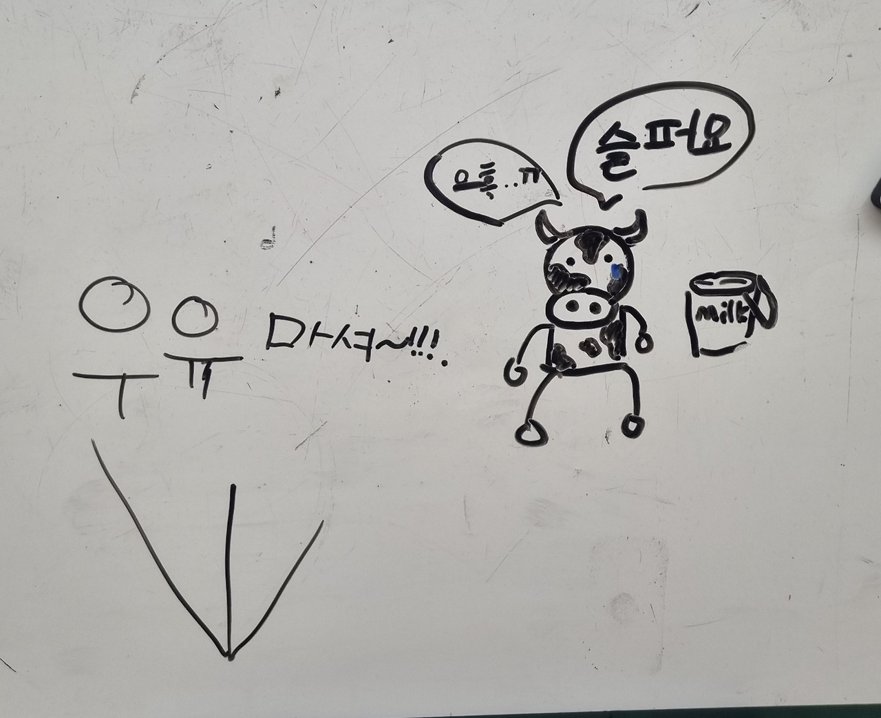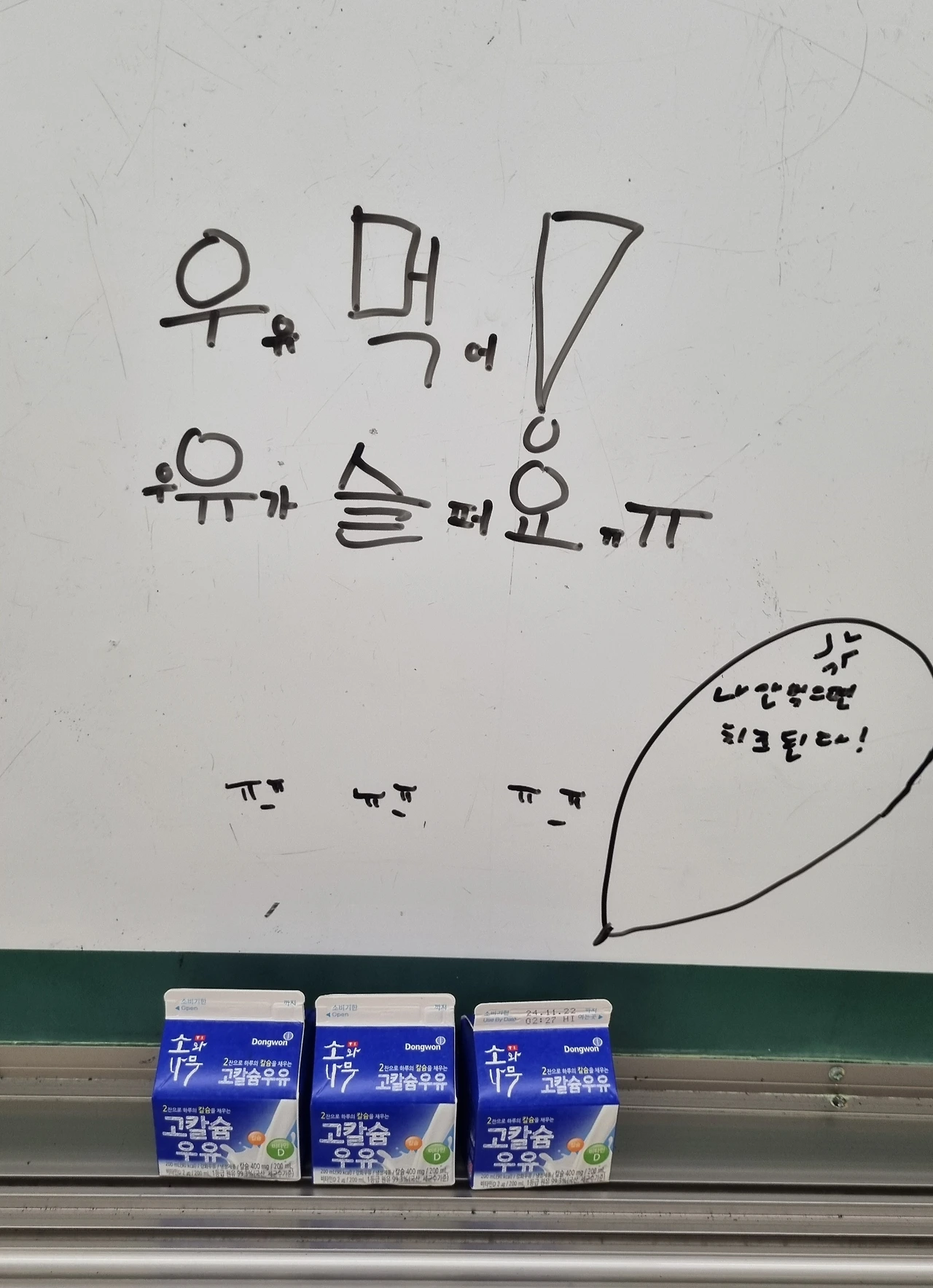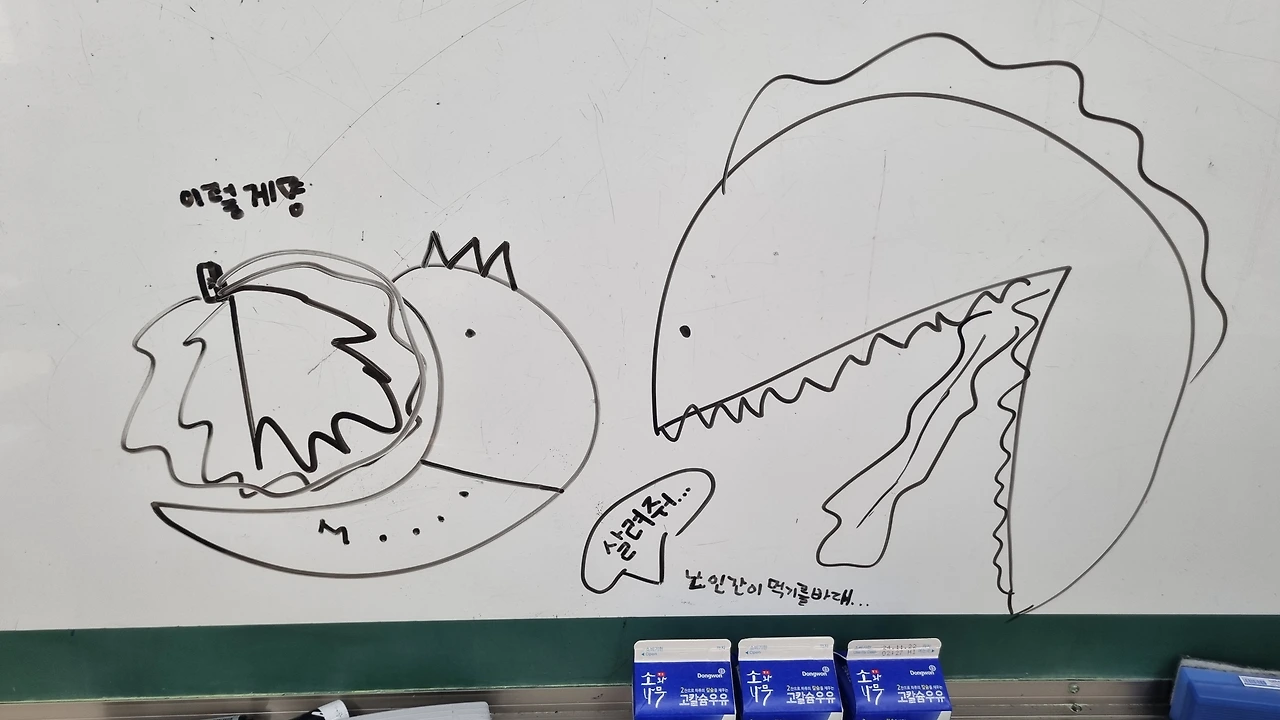 그래도 맨날 선생님이 우유가 슬퍼한다고 감정에 호소하니 아이들도 남은 우유의 슬픔을 외면할 수 없어 칠판에 온갖 그림을 그려 우유의 주인을 찾는다.