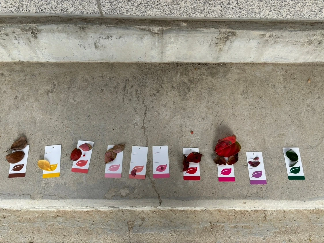 가을이 되면 꼭 하는 활동이 있다. 아무것도 그려지지 않은 커다란 광목천에 색깔 카드를 동그랗게 펼쳐놓고 최대한 비슷한 색의 자연물을 찾아오는 것이다. 단풍이 정말 예쁘게 들었을 무렵 운동장으로 준비물을 챙겨 나가서 바닥에 하나씩 펼쳐 놓으면 아이들의 궁금증이 폭발한다.