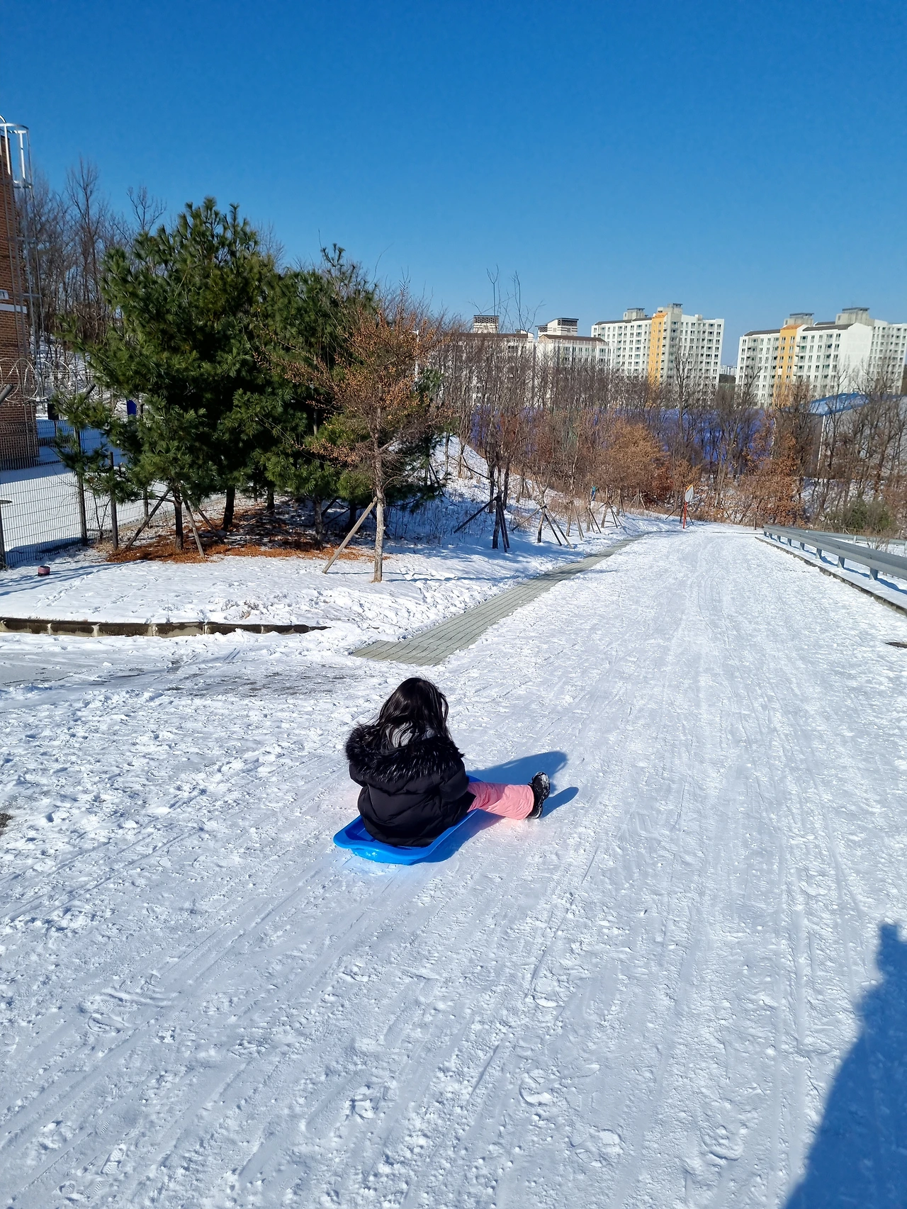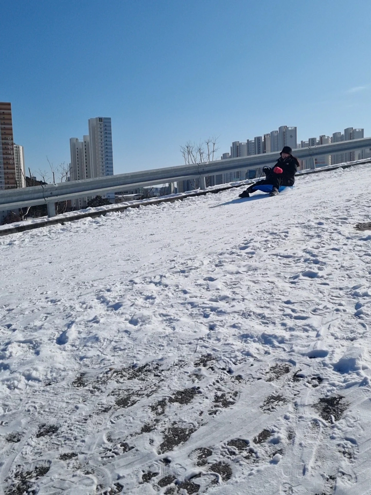 어딘지 살펴보니 공원 옆으로 높고, 길이가 꽤 긴 경사로가 보였다. 춥다는 남편에게 잘 됐다며 책 반납을 부탁하고 올라가 본다. 평소에 차가 다니는 것을 보긴 했지만 길 끝은 철조망으로 막혀있고, 제설도 안 해서 당분간 차가 다닐 일은 없어 보였다. 그리고 실제 타는 사람들이 너무 즐거워 보인다.