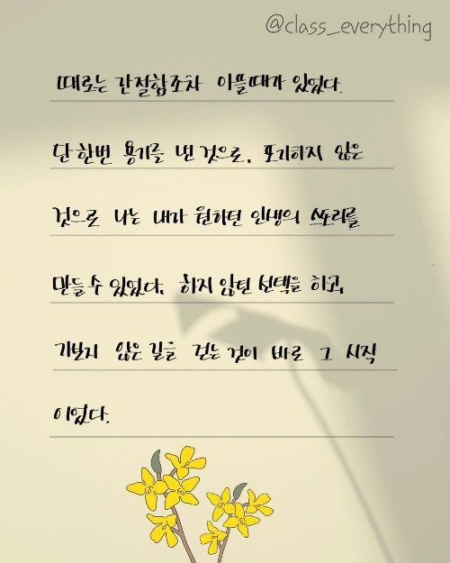 단 한 번 용기를 낸 것으로, 포기하지 않은 것으로 나는 내가 원하던 인생의 스토리를 만들 수 있었다. 하지 않던 선택을 하고, 가보지 않은 길을 걷는 것이 바로 그 시작이었다.
