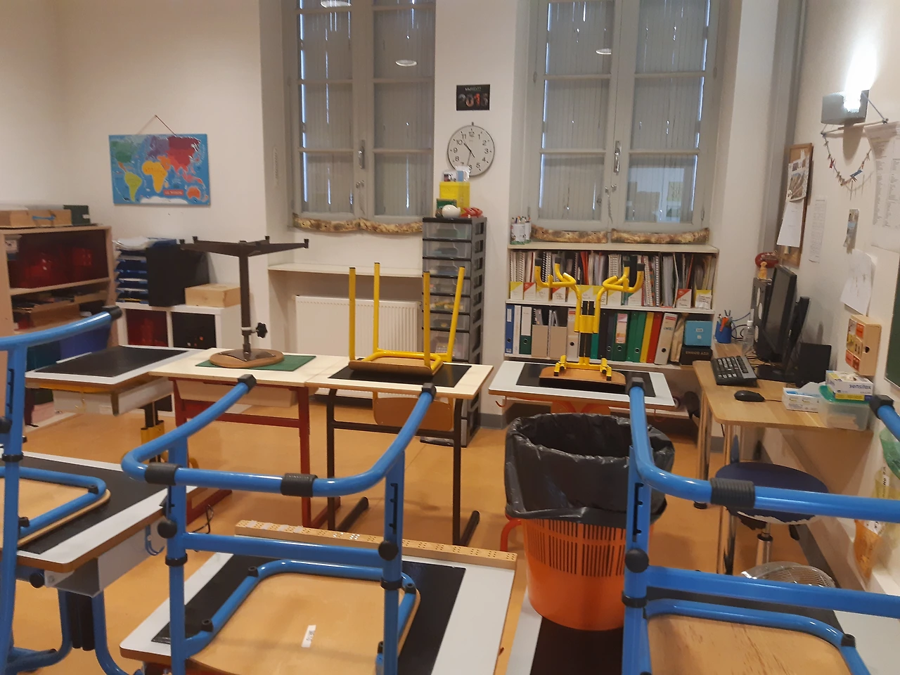 그래서 만나게 된 툴루즈 맹학교의 인사담당자. 중도 중복 학생 부서 담당 디렉터이기도 하다. 서로 자기소개를 하고, 바로 학교 투어에 나섰다. 아직 개학 전이라 수업을 준비하는 교사들과 평생교육을 받는 성인 장애인들만 만날 수 있었다. 동의하에 학교 안 구석구석을 다니며 사진을 찍을 수 있었던 것도 나름 좋았다. 툴루즈 맹학교는 주변 지역인 몽토방, 알비, 카르카손을 커버하는 지역 거점학교이다. 매일 등교를 하는 학생도 물론 많지만 거리 때문에 기숙사에서 생활하거나 학생들에 따라 필요한 수업만 일주일에 하루만 출석해 듣는 경우가 대부분이라고 한다. 같은 반에서도 매일매일 수업을 들으러 오는 학생 수가 달라지니까 통학버스나 기숙사 방을 배정하고 준비하는 것 모두 쉽지 않은 일이니 학교 구성원 모두 유동적으로 대처해야겠다는 느낌이 들었다. 문득 작년 초에 특수학교에서 일할 때 통학 담당 선생님이 개학 연기에 격일 등교 때문에 고생했던 게 생각났는데, 여기는 일상이 그러하구나 라는 생각이 떠올랐다. 학교를 둘러보고 들은 생각을 종합해보면 세계 많은 특수학교를 다녀봤지만 역시 최초의 맹학교답게 부서가 세분화되어 있고 그래서 전문화된 맞춤형 서비스를 제공해줄 수 있구나, 라는 것이었다.
