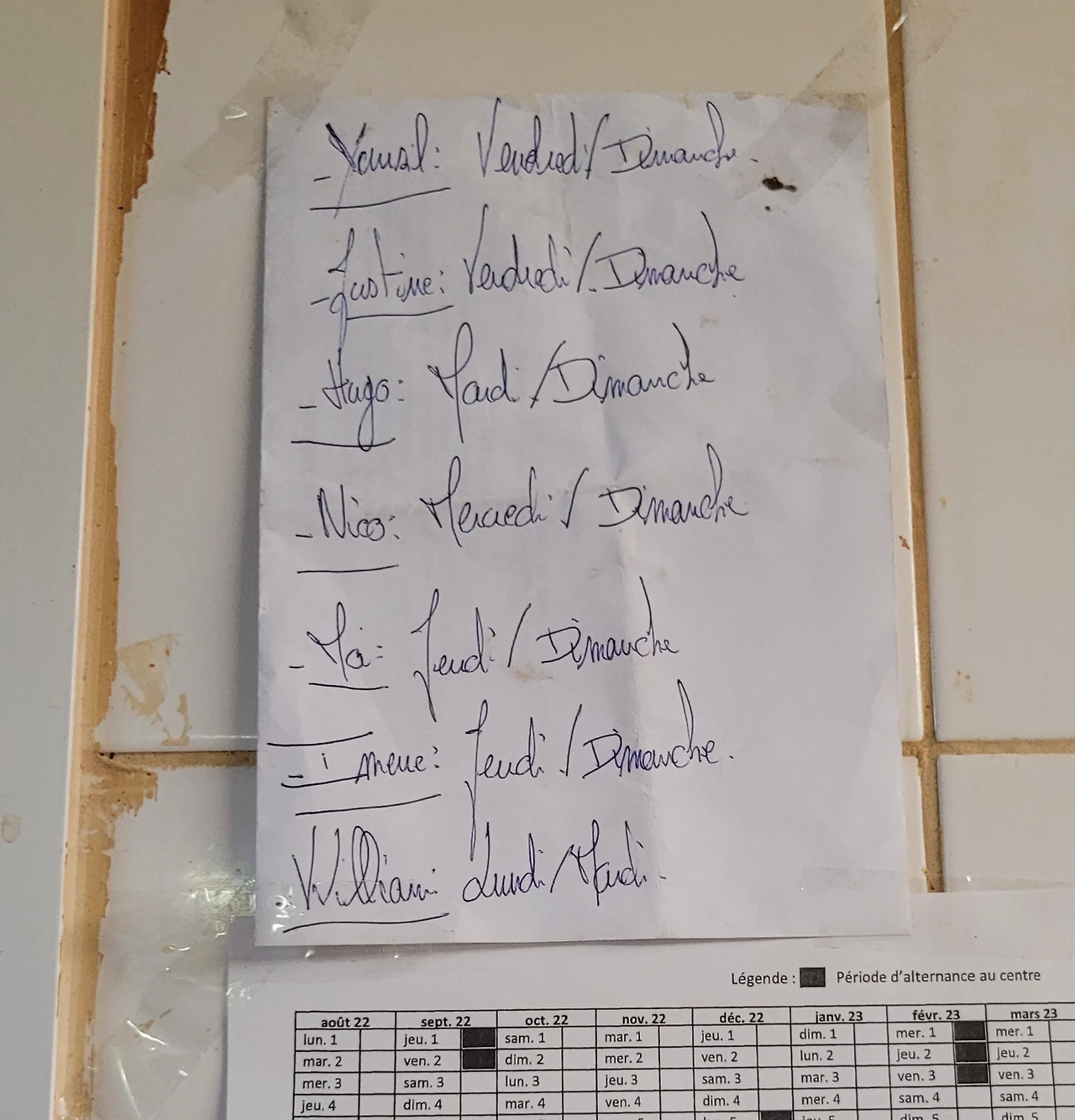 그리고 몇 차례의 면접과 하루씩 일해보는 jour d'essai를 거쳐 4명의 새로운 어프헝티와 일하게 되었다. 제빵팀 1명과 제과팀 3명. 작년 제빵팀에서 일하던 어프헝티 중 2명은 정직원으로 고용되었고 나와 동갑내기 동기인 필립은 올해 제빵 상위 과정을 더 공부하게 되어 1명만 새로 들어오게 되었다. 제과팀에는 저스틴, 이멘, 윌리엄 3명의 어프헝티가 들어왔다. 작년보다 1명 더 티오가 늘어나 총 7명이 일해 다 모이면 주방이 다 북적북적하다. 그리고 주방 벽에 붙은 제과팀 휴무일 표.