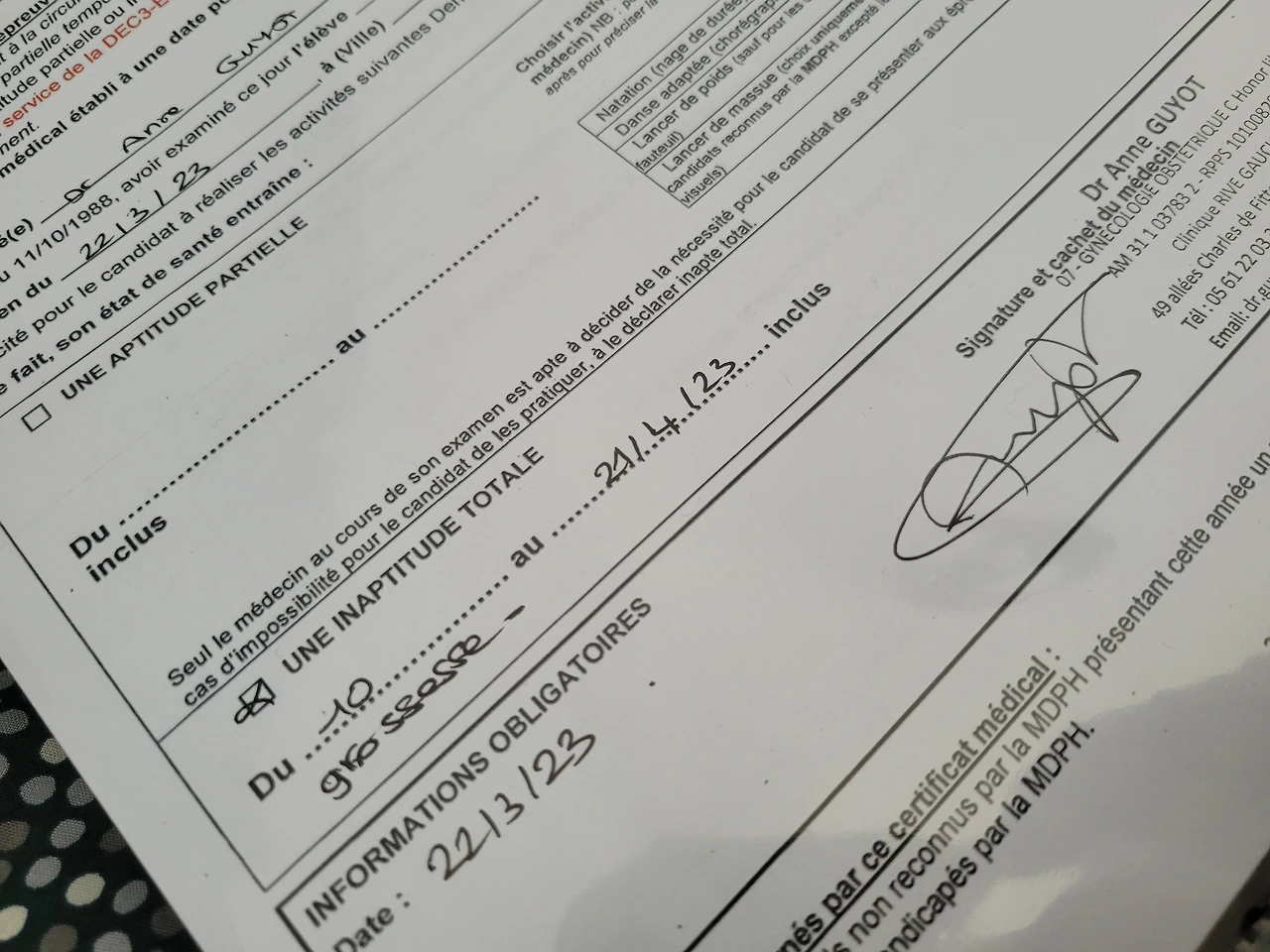 4월에는 CAP 시험 중 스포츠 시험이 예정되어 있다. 나와 엘리시아가 선택한 시험 주제는 800미터 달리기. 여학생 기준으로 3분 30초 이내에 완주해야 만점을 받을 수 있는 쉽지 않은 시험이다. 참고로 나의 최고 기록은 4분 10초였나? 이것도 매주 연습을 해서 속도를 조금씩 줄여나간 덕분이었다. 하지만 임신 사실을 알았을 때 가장 우려되었던 점이 이 시험에 과연 응시할 수 있을까? 였다. 혹여나 넘어지기라도 하면? 4월에도 엄청 더운 남프랑스에서 달리다 탈진이라도 하면 어쩌나 온갖 걱정이 앞서 들었다. 이 걱정을 말하니 알리시아의 답은 명쾌했다. 산부인과의사나 주치의에게 서류를 받으면 스포츠 시험을 면제받을 수 있다는 것이었다. 마침 12주 차 정밀초음파가 있던 날이라 바로 서류를 받아왔다. 참고로 프랑스는 12주가 지나야 만 임신확인서를 발급받을 수 있다. 아마 12주 이전에 이 서류를 받으려고 했어도 불가능했을 거란 뜻. 덕분에 스포츠 시험을 3주 앞두고 시험 면제를 받을 수 있게 되었다. 덩달아 이번주부터 스포츠 수업도 면제! 10대 남학생들과 축구경기를 할 때마다 공을 피하기 바빴는데 참 다행이었다. 뿌리부터 한국인인 나는 체육 선생님께 수업에 빠져서 죄송하고, 괜한 특권을 누리는 것 같아 미안하다고 말씀을 드렸다. 쿨한 체육 선생님은 눈을 찡긋하고 엄지손가락을 치켜세운다. 나의 권리를 먼저 생각하는 것. 참 잘 안 되는 것 중의 하나이다.