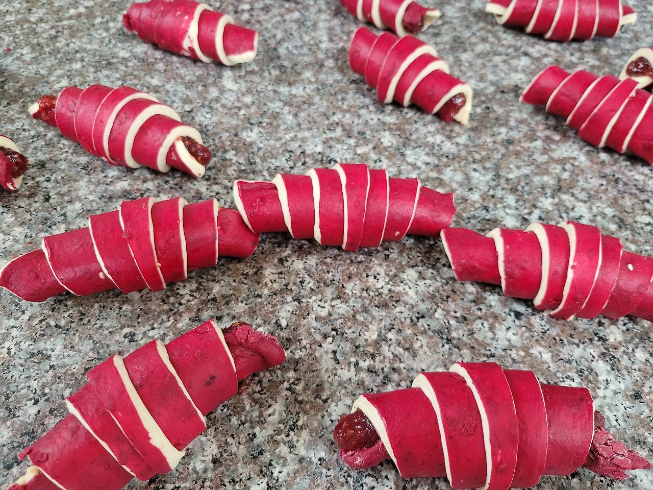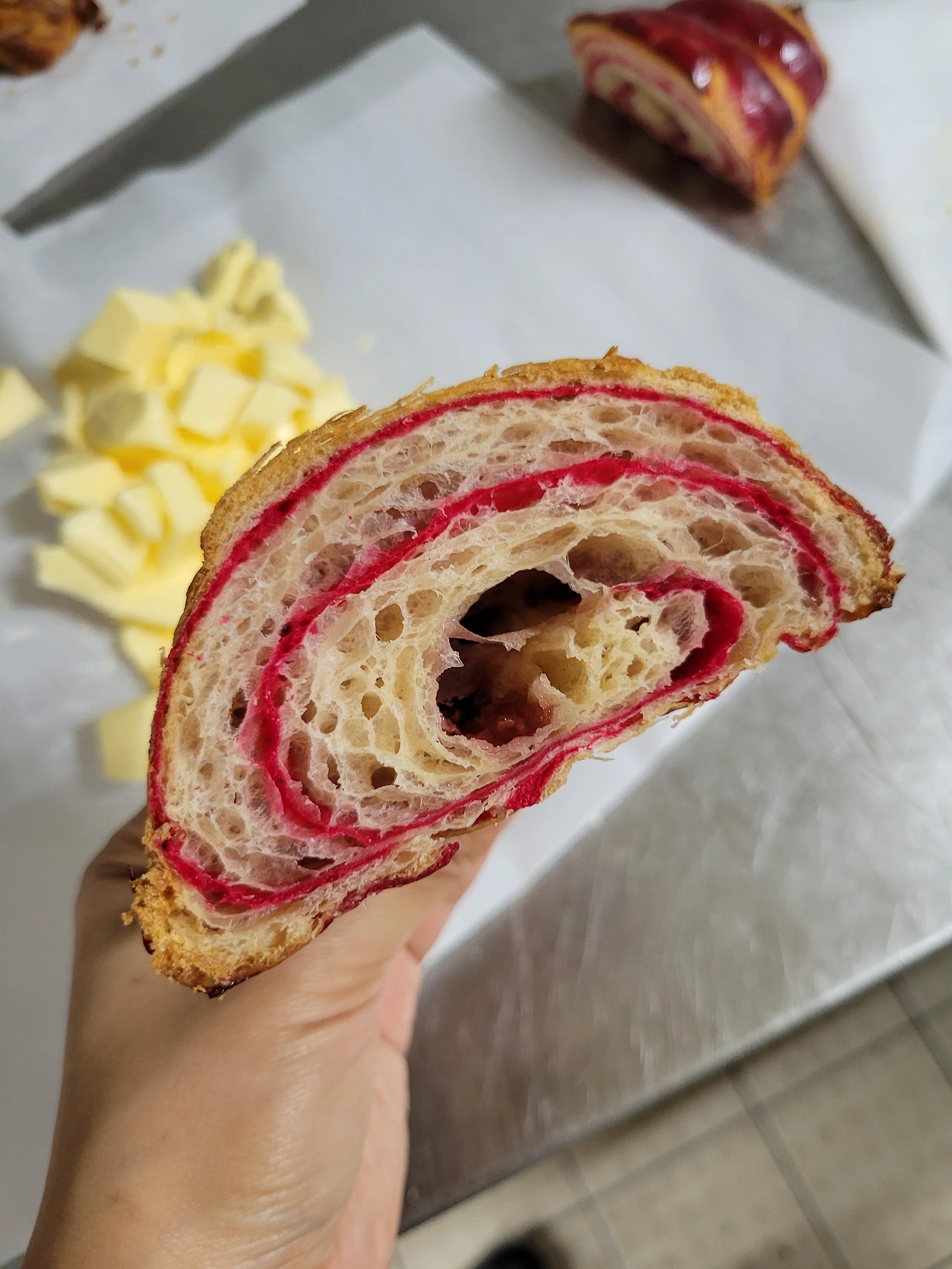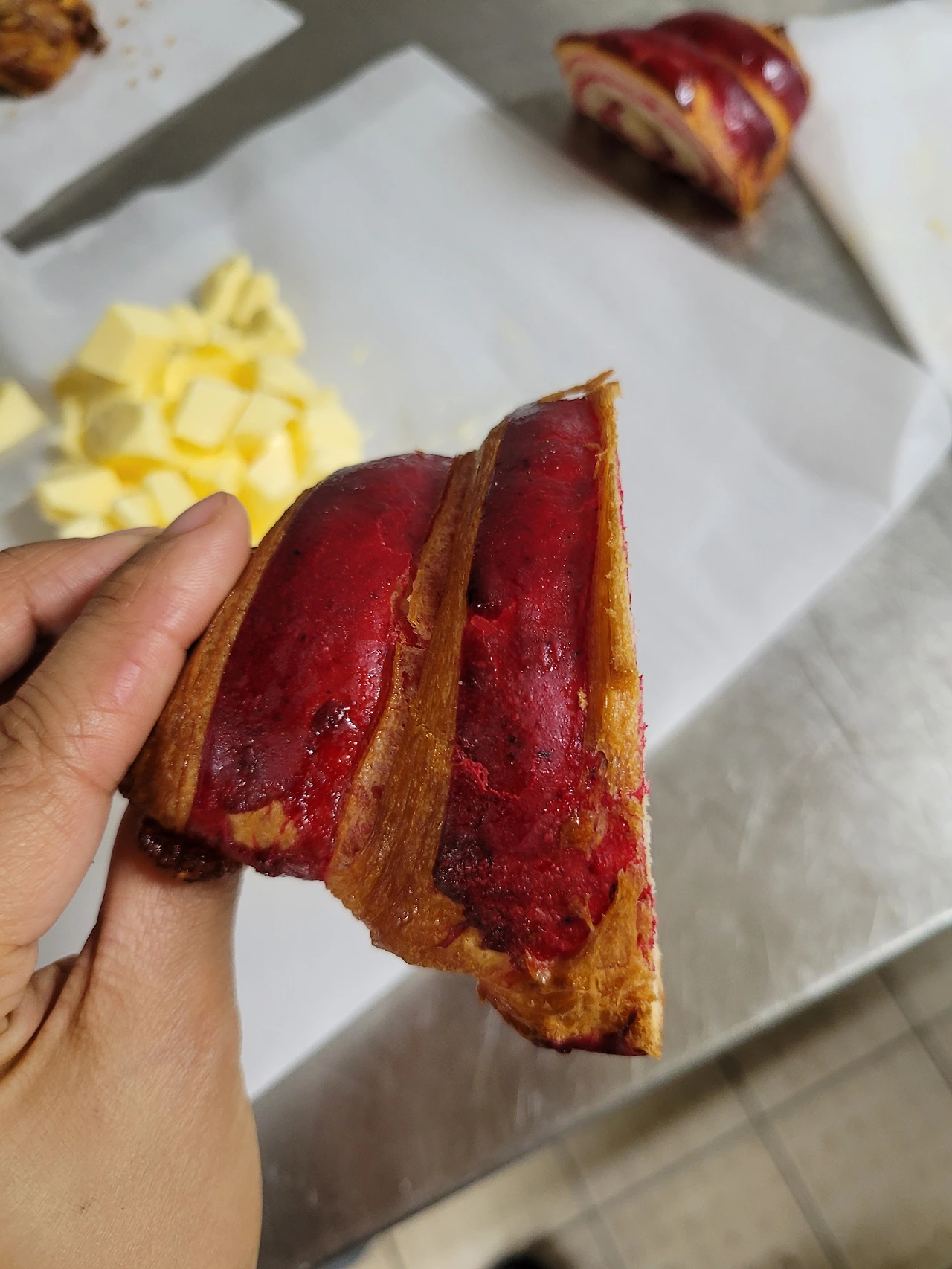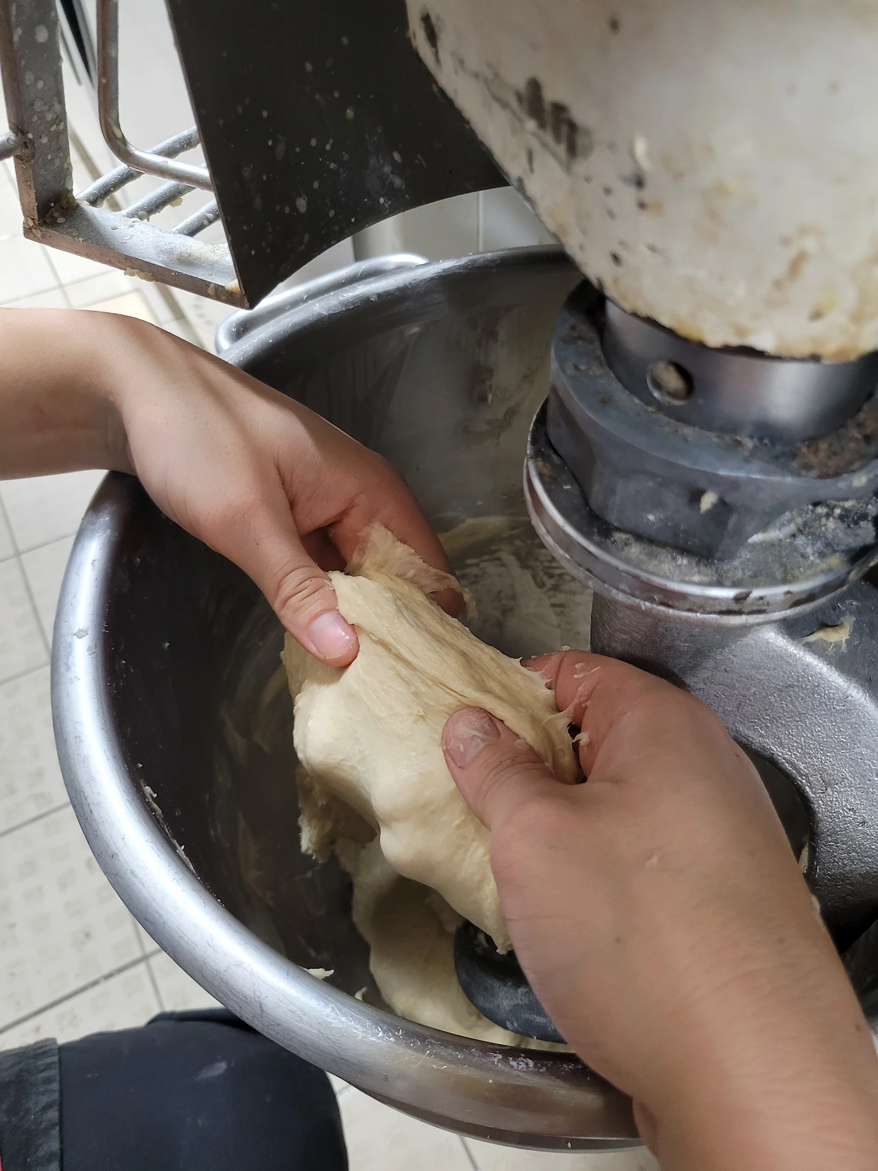위 사진은 버터를 넣기 전에 반죽에 충분히 글루텐이 생겼는지를 확인하는 과정이다. 지난번 모의시험 때 반죽기 벽면에 붙은 반죽을 잘 긁어서 섞지 않은 게 문제였던 것 같다. 바닥끝까지 잘 긁어내는 게 중요!