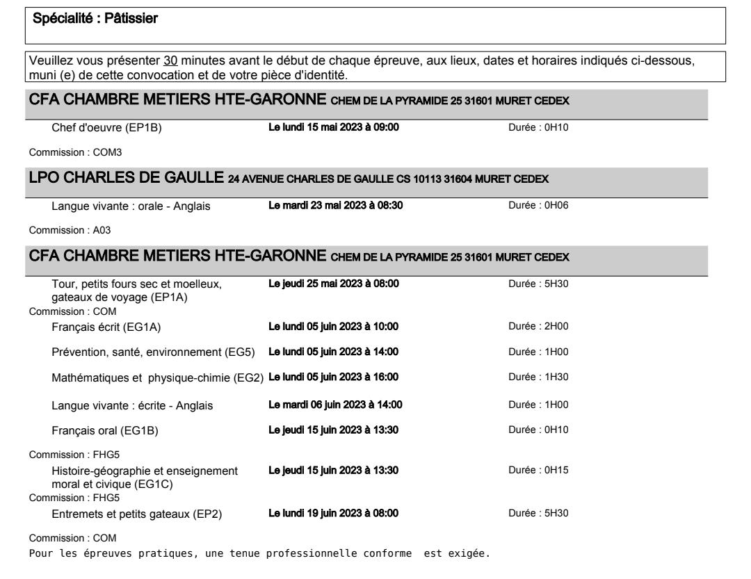 드디어 나온 CAP pâtissier Convocation! 시험 날짜가 정해졌다.