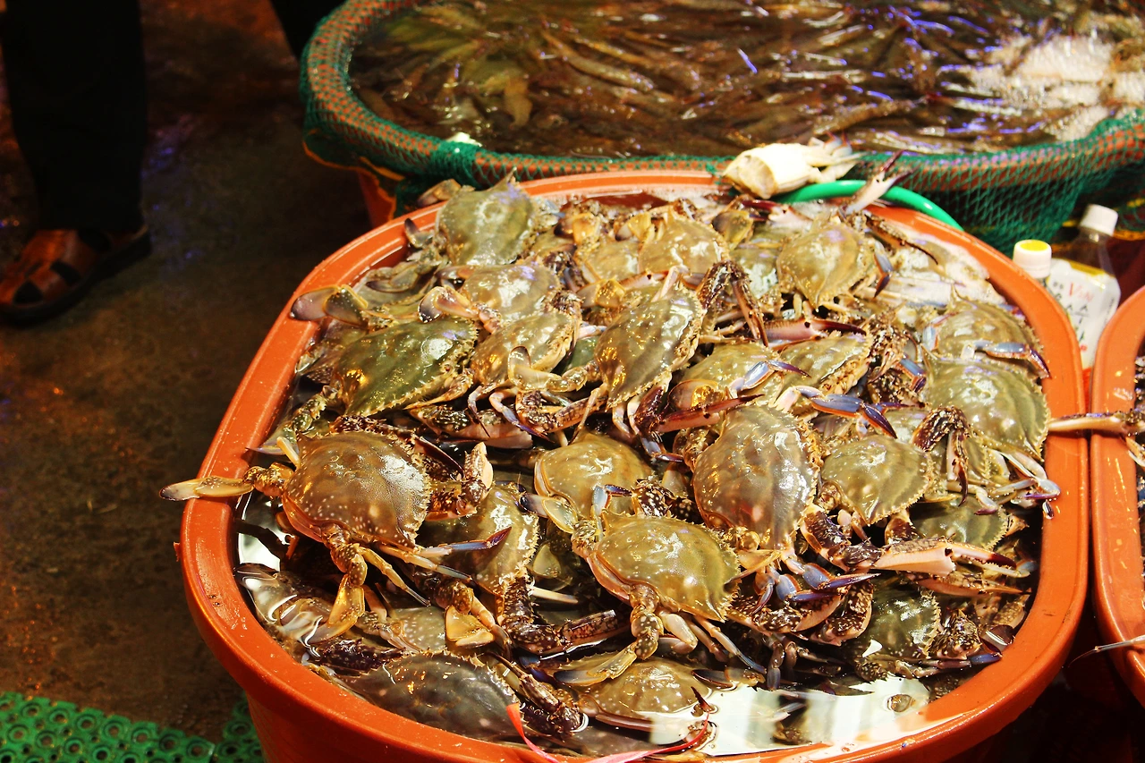새우, 전어와 함께 어시장의 인기를 담당했던 꽃게는 그 신선도가 남달랐다. 살아있는 생선이나 갑각류를 무서워하는 나에겐 꽃게 친구의 신선도가 꽤나 위협적이었다. 날카로운 집게를 휘익 휘익! 휘두를 때마다 어찌나 소름 돋던지, 빠르게 시선을 다른 곳으로 옮겼다.