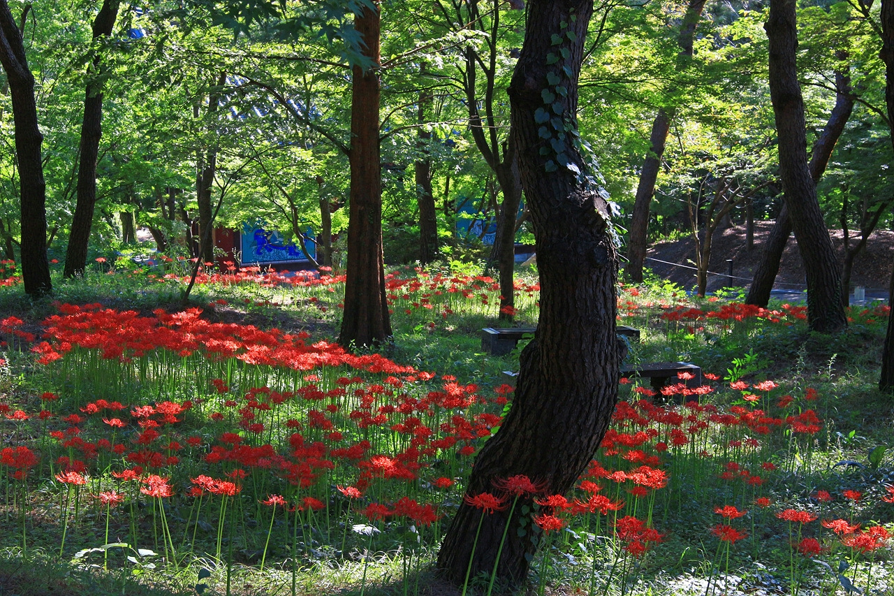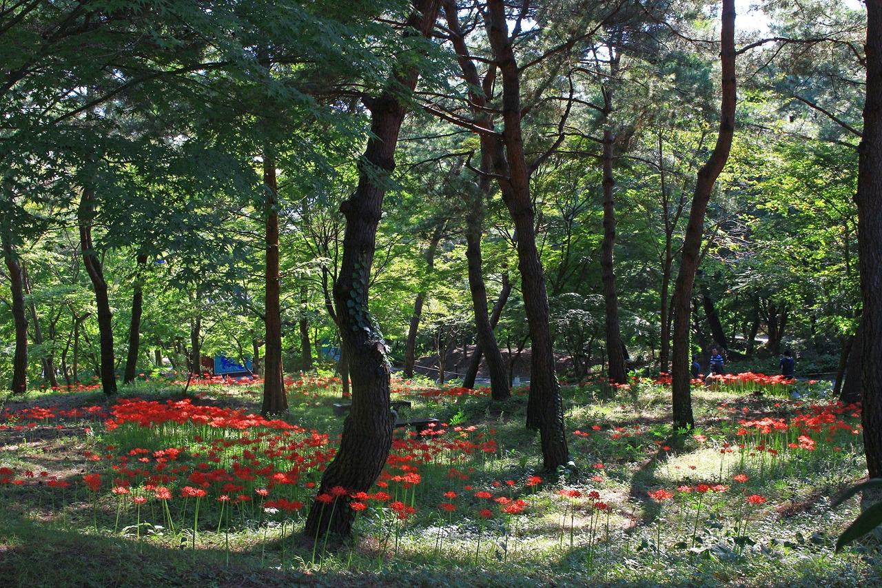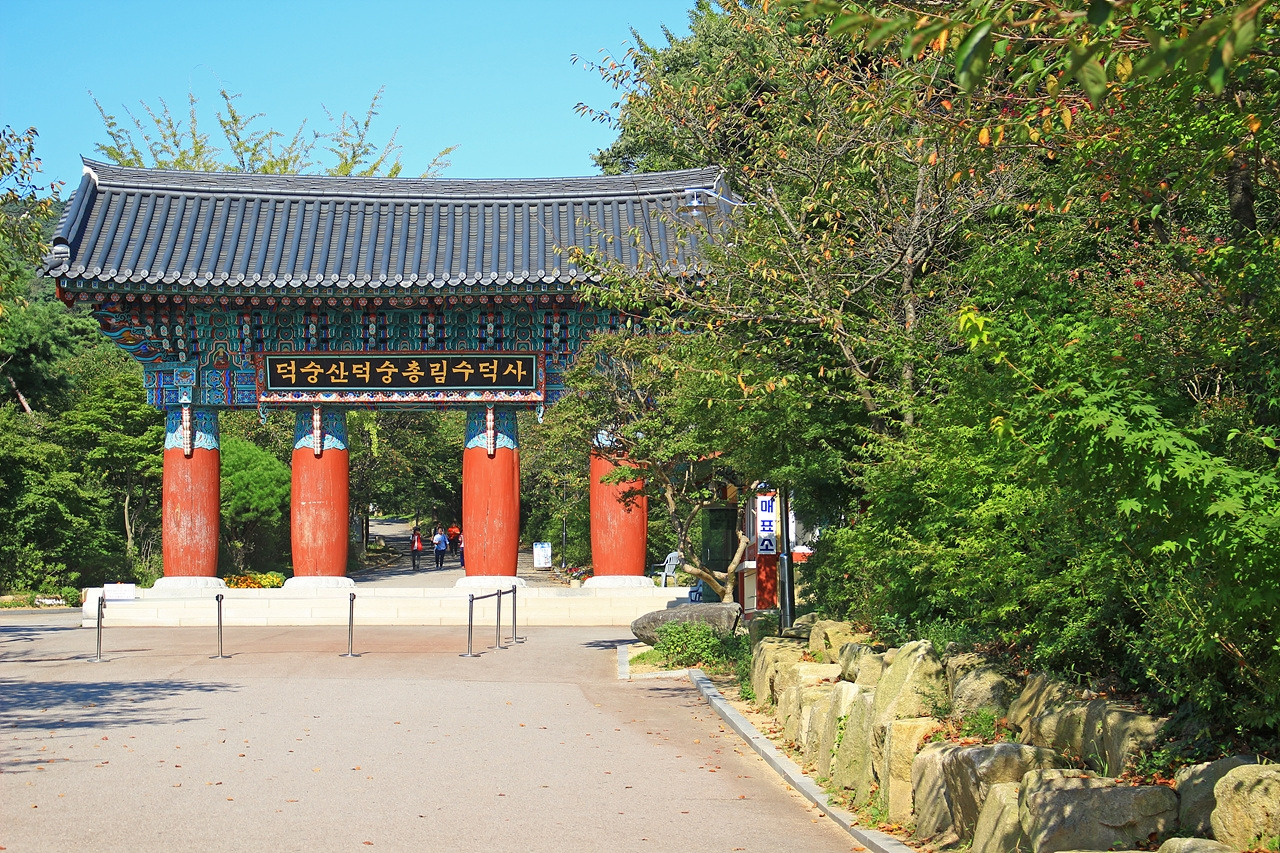 입구에 들어서기 전부터 천년고찰의 위엄이 느껴졌다. 축구장처럼 커다란 주차장에 한번, 매표소까지 이어진 거대한 상권에 두 번 놀랐다. 평소 수덕사를 찾는 여행객과 불자가 많다는 방증이다. 사찰의 시작점을 알리는 일주문에는 '덕숭산수덕사', '동방제일선원'이라는 현판을 나란히 걸어 조계종 7 교구 본사의 품격을 높였다. 짙은 녹음으로 뒤덮인 금강문과 사천왕문 샛길에는 붉게 물든 꽃무릇이 만발했다. 예상치 못한 풍경에 한참을 서서 감상했다. 꽃무릇 무리에 볕이 깔린 모습이 한 폭의 그림 같았다. 수백 점의 불교 문화재를 소장 전시하고 있는 '황하정루'를 지나 계단길에 올라섰다. 계단 너머 전경은 어떤 모습일까, 당장 눈에 보이지 않으니 기대감이 한층 더 높아졌다.