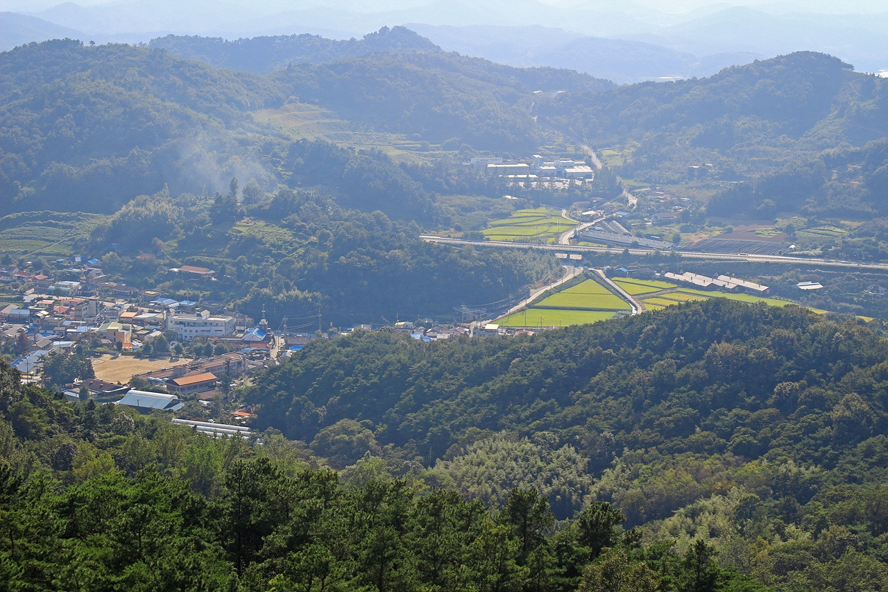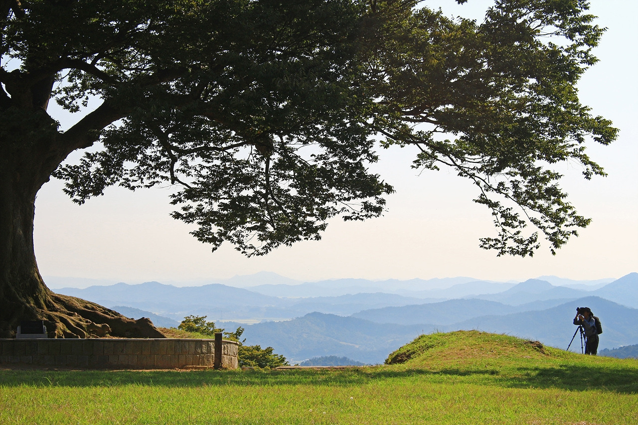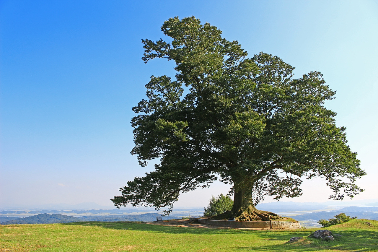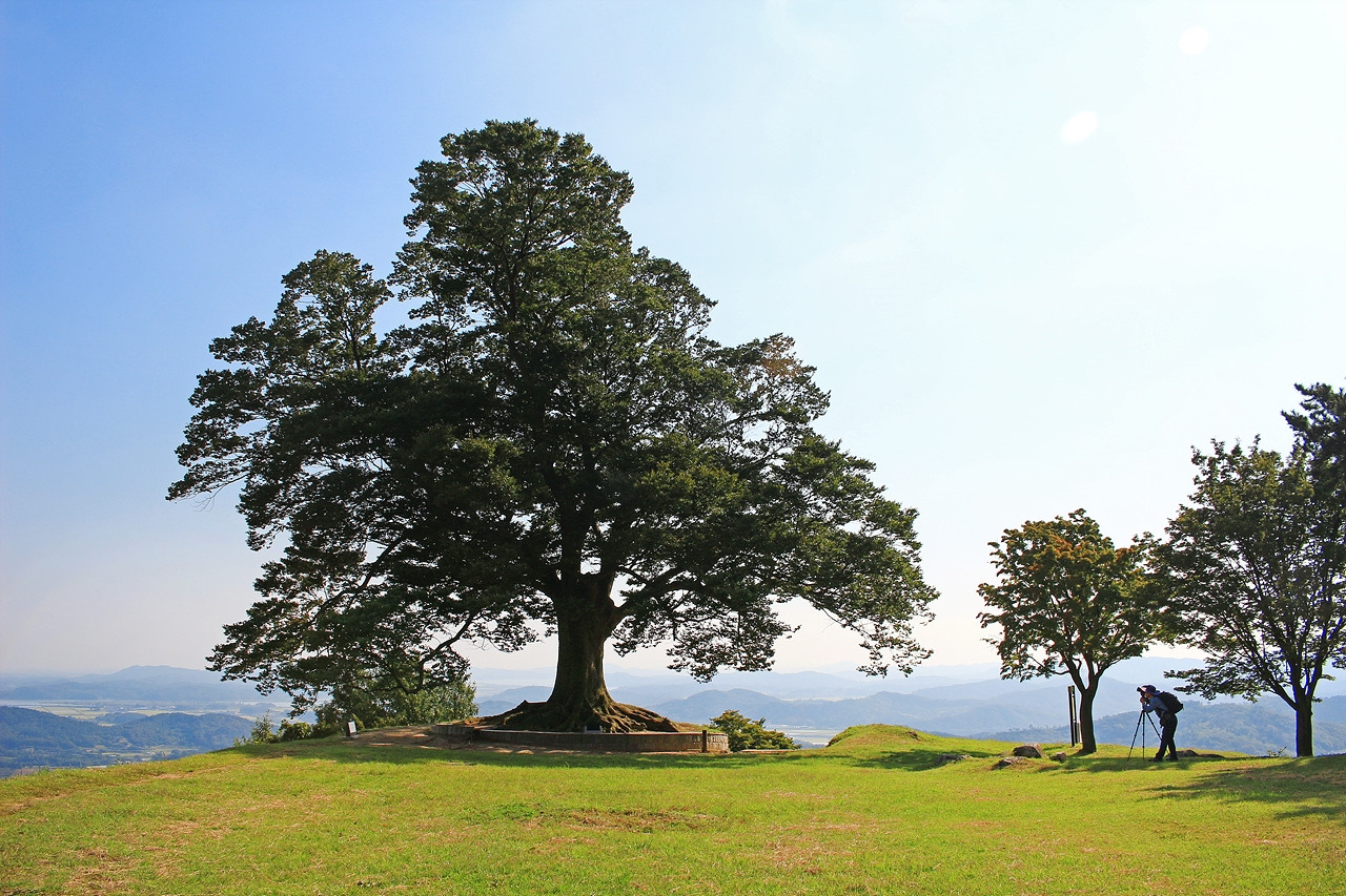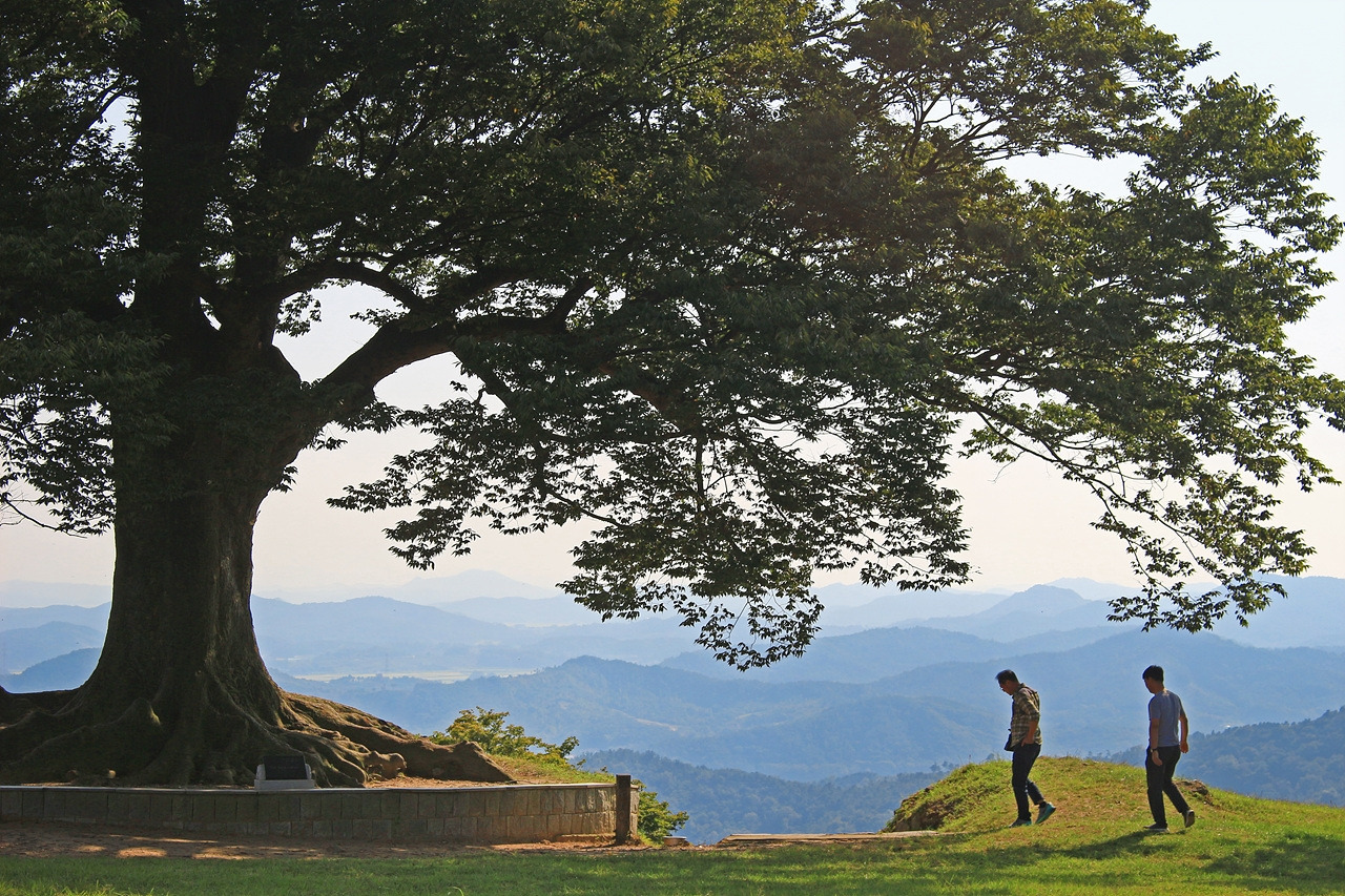 어느덧 사랑나무가 있는 성흥산 정상 부근에 도착했다. 홀로 서있는 느티나무 한 그루가 보인다. 거대한 나무의 크기가 딱 봐도 사랑나무였다. 나무 몸체 한쪽으로 하트 모양을 띄고 있는 굴곡진 나뭇가지를 확인하니 가히 사랑나무라 불릴만했다. 수령은 400년, 이토록 긴 세월 동안 느티나무가 품어온 풍경은 얼마나 다양할까. 아직 30년도 채 살지 못한 나는 그것을 상상조차 할 수 없다. 사랑나무 앞쪽으로는 부여, 논산, 익산 일대가 한눈에 조망된다. 백제의 가림성이 이곳에 축성된 이유를 알 수 있었다.