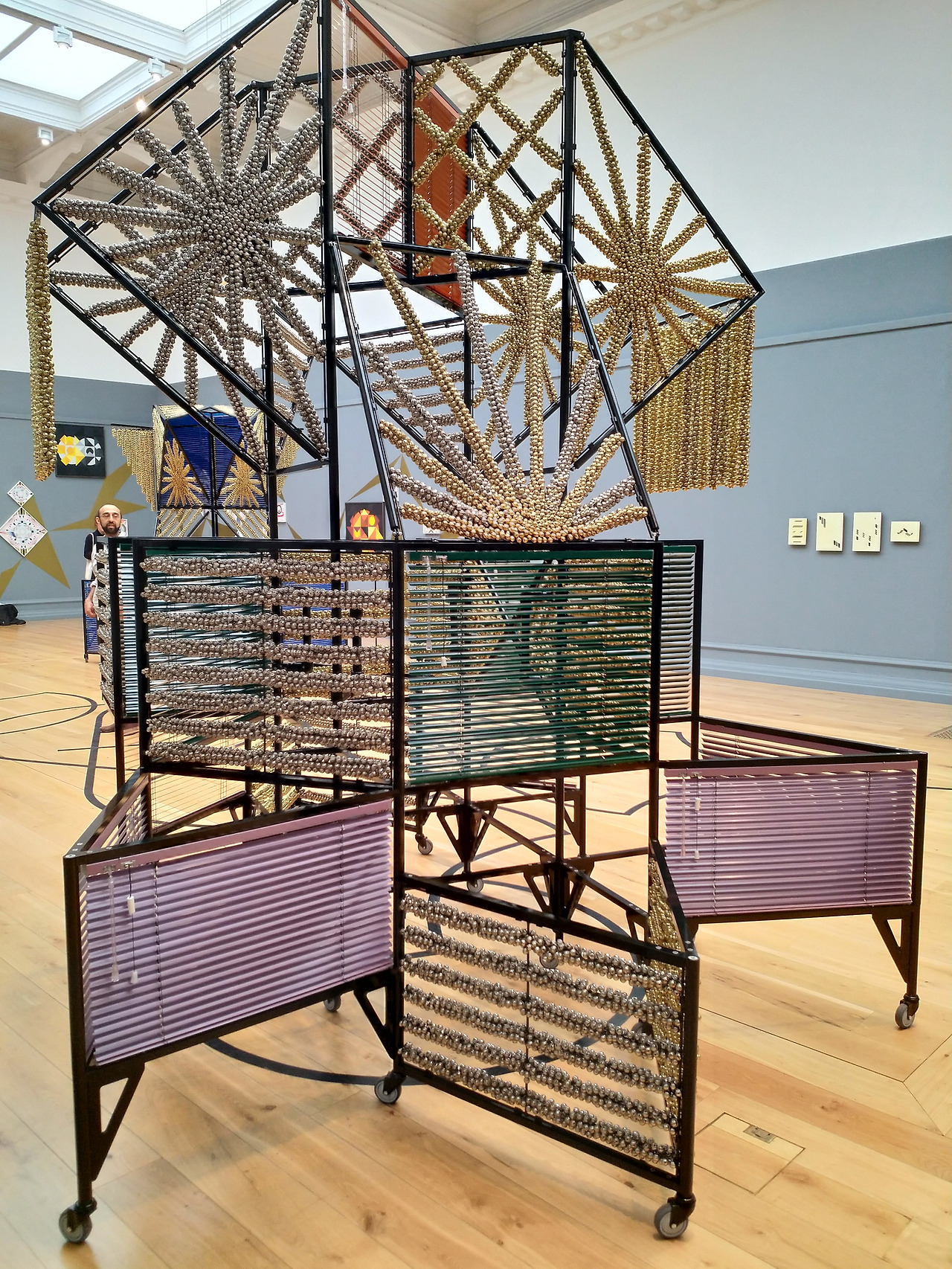 전시장에 들어서면 우선 눈에 들어오는 바퀴가 달린 두 개의 인상적인 대형 설치 작품 <Sonic Dress Vehicles>이 있었고, 그것은 그녀의 트레이드 마크인 블라인드와 무당이 쓰는 것과 같은 방울들로 조합되어 있었다. 그리고 설치 작품이 놓인 전시장 바닥에는 검은 테이프로 기하학적인 문양의 패턴이 사선으로 표시되어 있었는데, 영국 예술가이자 사회운동가인 Walter Crane의 나무 바닥 패널에서 영감을 얻었다고 한다.