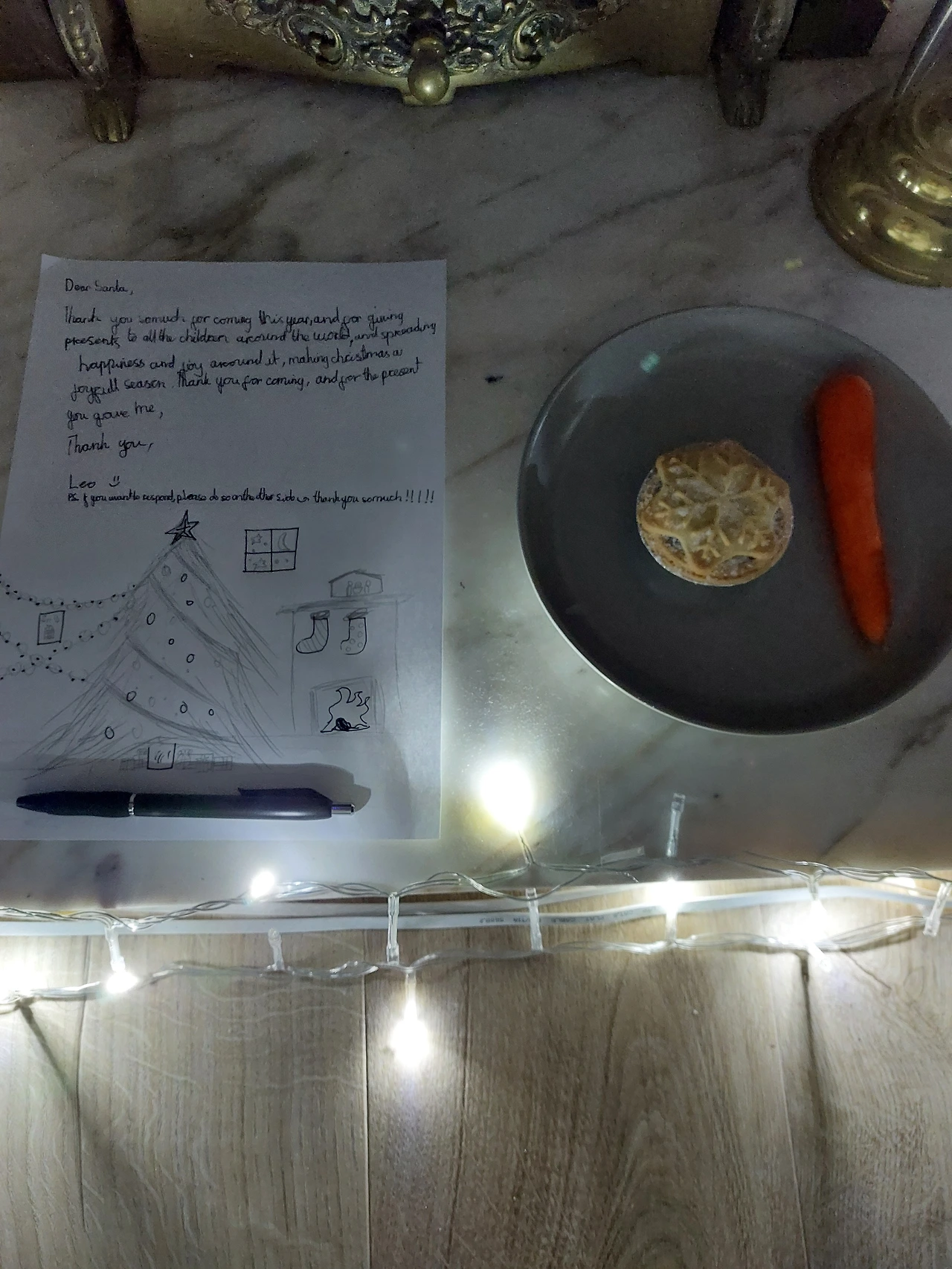 12월 24일 저녁, 잠자기 전 아들의 모습은 그 어느 때보다 설레고 비장하다. 이제 어엿한 중학생이 되었고, 엄마 아빠한테 쓸데없이 개기는 횟수도 늘어 착한지도 모르겠으니, 이번엔 산타가 안 올 수도 있다고 나는 벌써 며칠 동안 아이의 마음을 떠봤다. 혹시라도 아이 친구들이 산타가 없다는 사실을 폭로했을지도 모른다는 생각도 들어 산타가 온다고 해야 하나 말아야 하나 고민이 되기도 했기 때문이다. 하지만 산타에 대한 아이의 태도엔 변함이 없었다. 작년과 마찬가지로 산타를 맞을 준비를 했다. 아이는 A4 용지 한 장을 꺼내고 볼펜을 집어 들어 산타에게 고마움의 편지를 썼다. 그리고 추석의 송편처럼 영국에서 크리스마스 때 챙겨 먹는 민스파이와 당근을 접시에 담아 벽난로 앞에 두었다. 산타와 루돌프를 대접하기 위한 음식이 놓인 접시와 편지를 가지런히 놓은 후 마지막으로 아이는 집안에 장식된 모든 크리스마스 전구를 켰다. 산타가 집으로 들어오는 통로인 벽난로 주변, 벽난로부터 트리가 있는 바닥, 그리고 트리까지 집안 곳곳 아이의 마음처럼 예쁜 불빛들이 반짝반짝 빛났다.