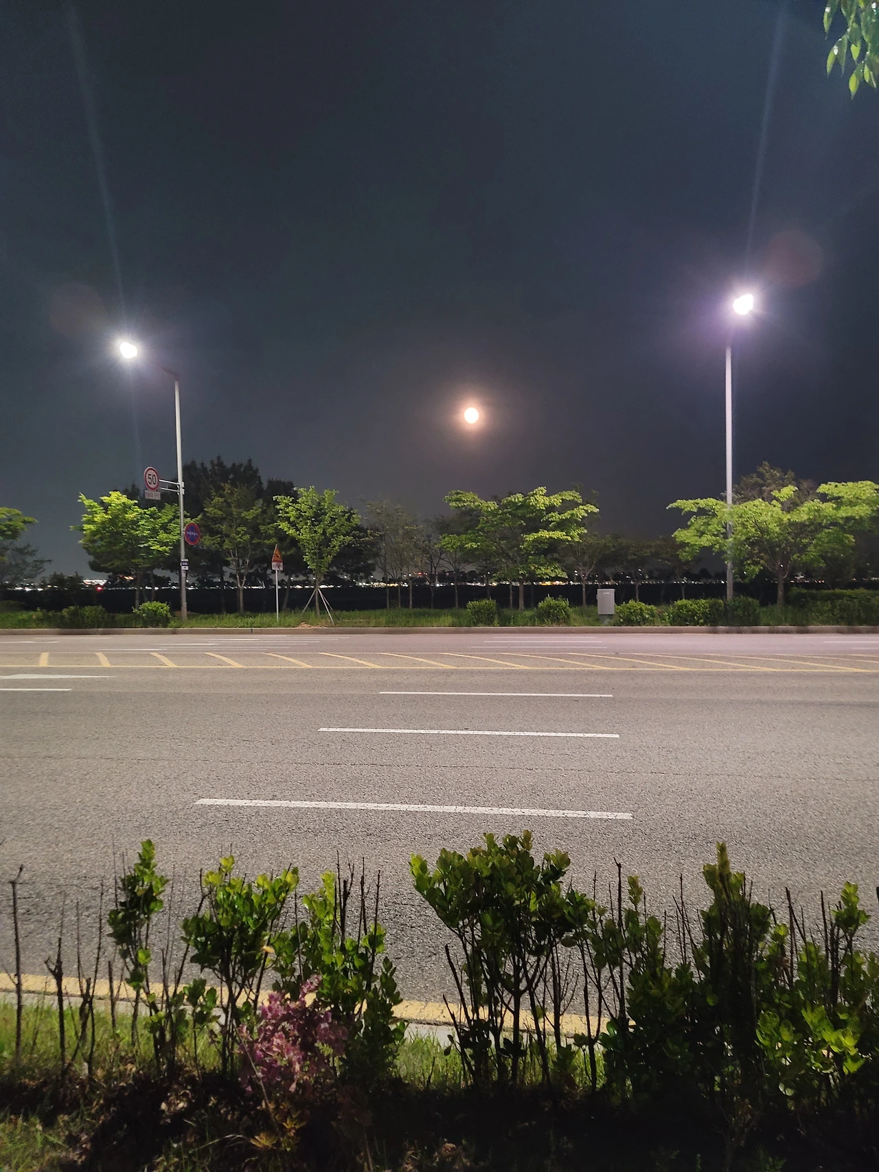 달 앞에 있는 유난히 밝고 하얀 가로등 불빛이 유치해 보인다.