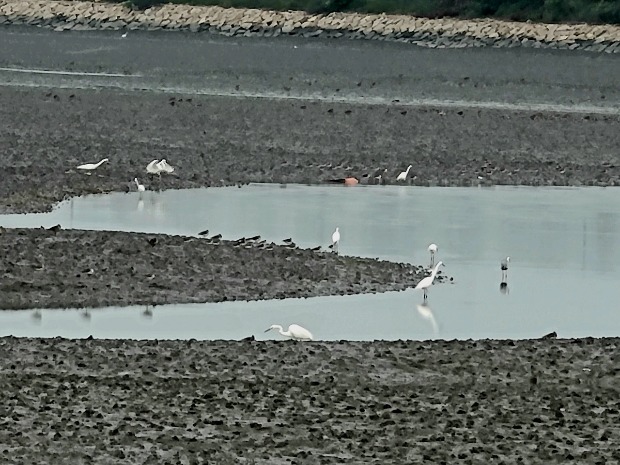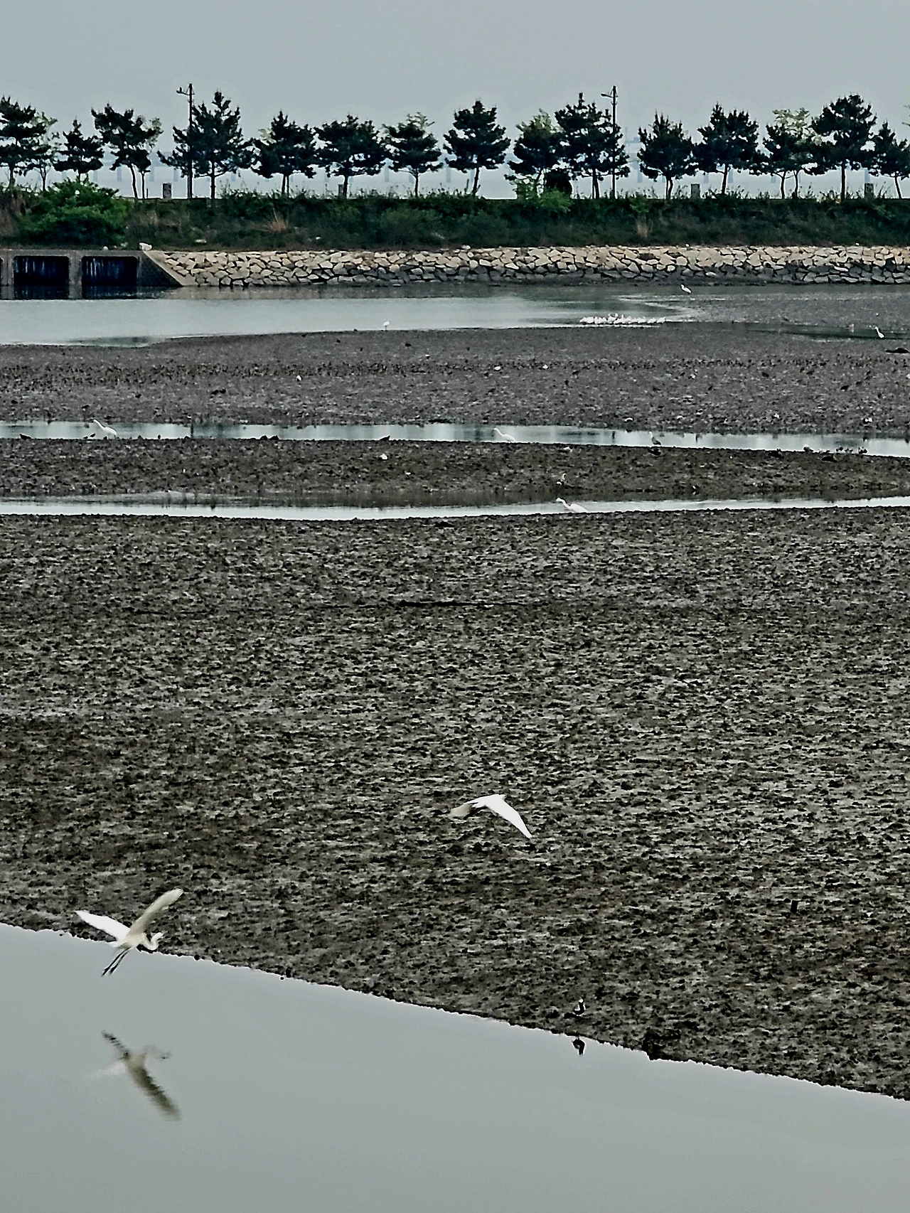 갯벌엔 많은 새들이 모여 앉아 있다. 산책을 하다 말고 주저앉은 강아지 때문에 끝까지 가지 않기로 했다.