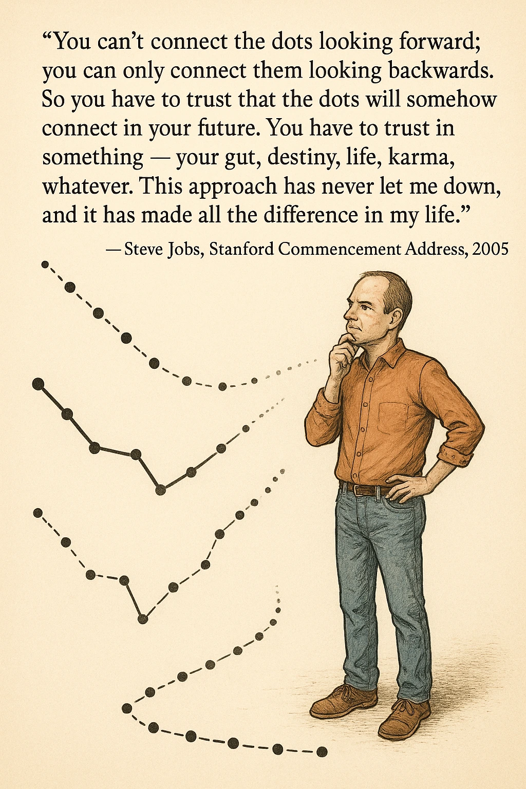 '오직 뒤를 돌아봤을 때만 점들을 연결할 수 있습니다.'