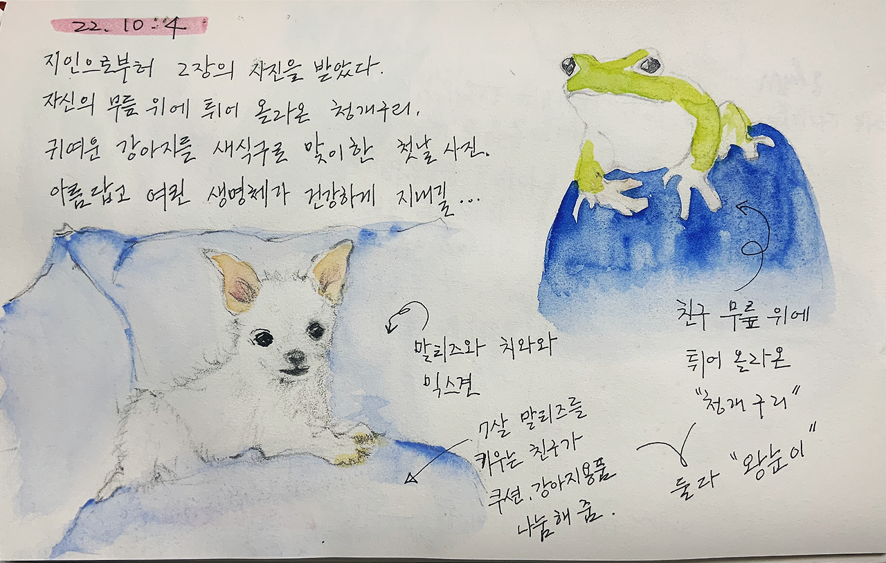 친구가 보낸 SNS 사진이 그림 소재가 되기도 합니다. 드로잉 저널을 쓰기 전에는 '좋아요'를 누르고 잊고 지낼 법한 사진인데