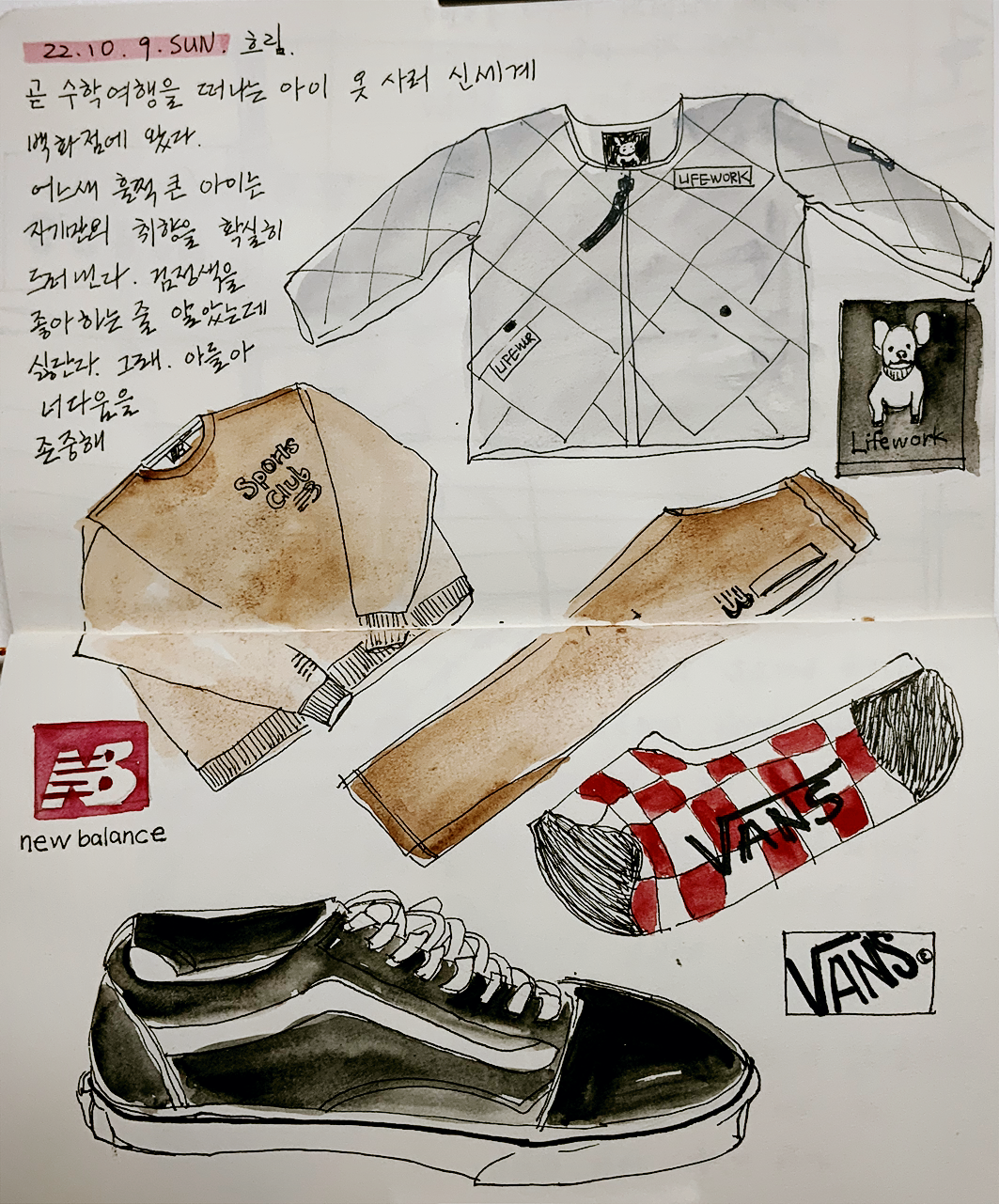 안방 바닥에 펼쳐놓고 그립니다. 아들은 그런 엄마가 싫지 않은 모양인지 신발끈 가지런히 묶어 가져다주며 머쓱 웃습니다.