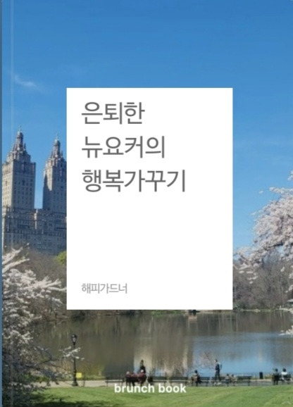 지난 3주 동안 발행한 글을 재정비하고 다듬어 드디어 나의 첫 브런치 북을 발행했다. 표지는 내가 제일 좋아하는 센트럴파크에서 찍은 사진을 선택했다. "은퇴한 뉴요커의 행복가꾸기"로 제목을 정하고, 17편의 글을 실었다. 누군가에겐 명함도 못 내밀 작은 숫자의 미미한 글이지만, 나의 글쓰기 일 년이 담겨 있어 부족해도 뿌듯해하련다. 잠깐만이라도 지루함의 끝에서 맛보는 짜릿하고 달콤한 즐거움을 느껴보리라.