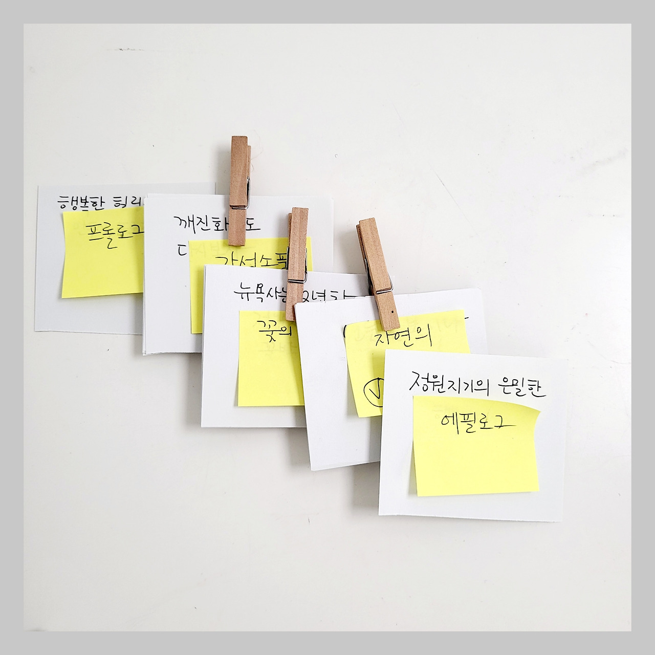 그동안 발행한 스토리를 찾아보니 53편이었다. 1년 동안 일주일에 한 번씩 빠지지 않고 꾸준히 글을 올린 셈이다. 우선, 주제별로 글을 묶기 위해 인덱스카드에 글 제목을 다 적었다. 역시 자연과 꽃에 대한 글이 대다수였다. 그리고 포스트잇을 붙여 아날로그식 분류를 하고, 브런치 북에 들어갈 5가지의 소제목으로 나눴다.