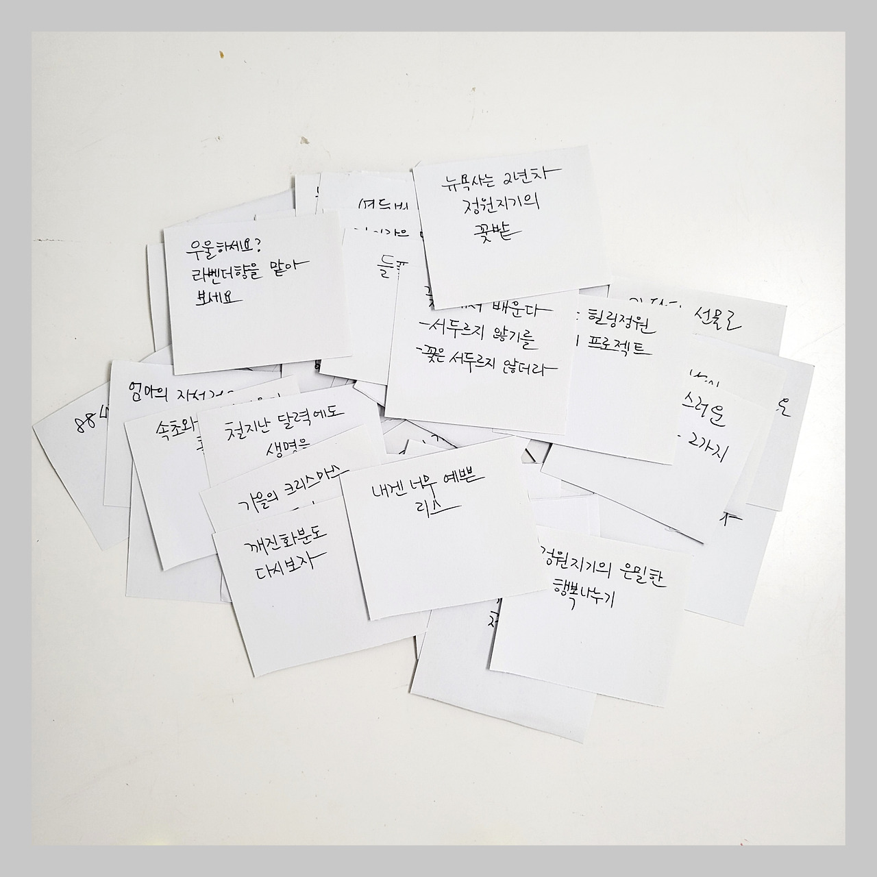 종이에 쓴 제목을 한꺼번에 보는 순간, 그동안 글을 쓰며 보낸 수많은 지루했던 순간들이 떠올랐다. 심지어는 "이거 내가 왜 하고 있지?"란 후회 섞인 마음은 또 얼마나 많이 가졌던가? 뭘 써야 할지 막막하고, 생각이 나질 않아 어렵다고만 생각했는데 운동 코치의 말대로 책상 앞에 앉아 있어야 하는 지루함이 힘들었을 수도 있었단 생각도 든다.