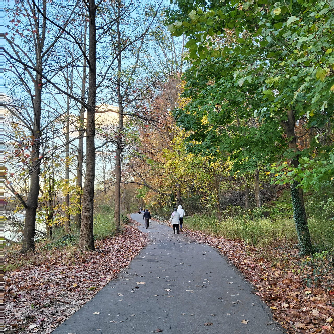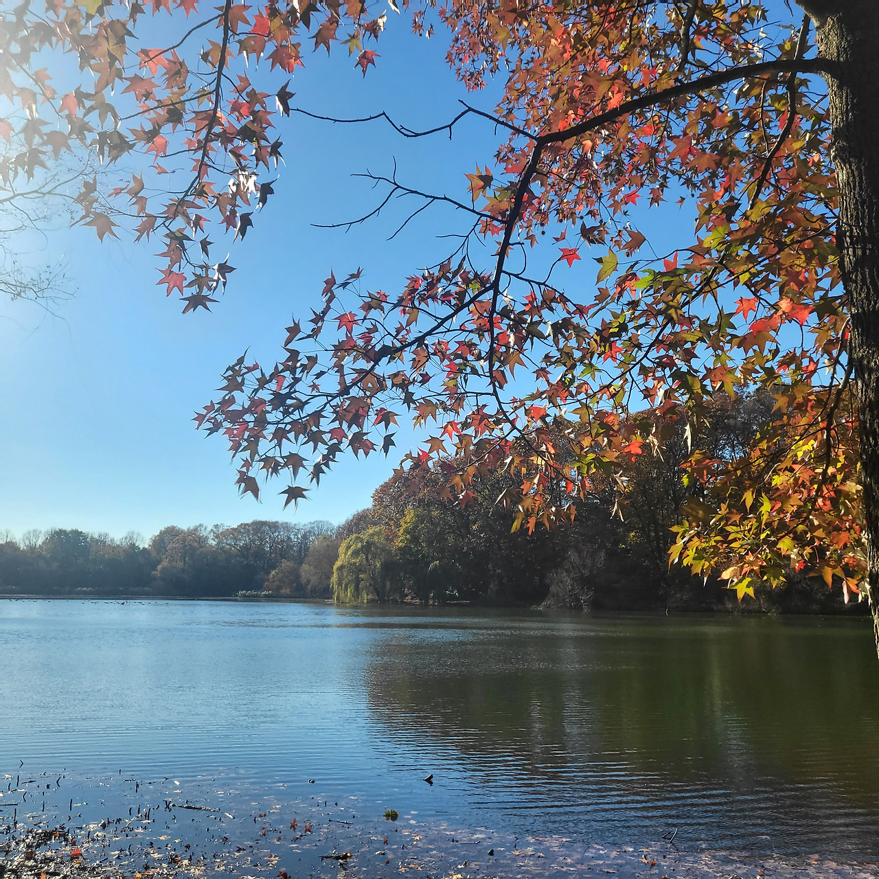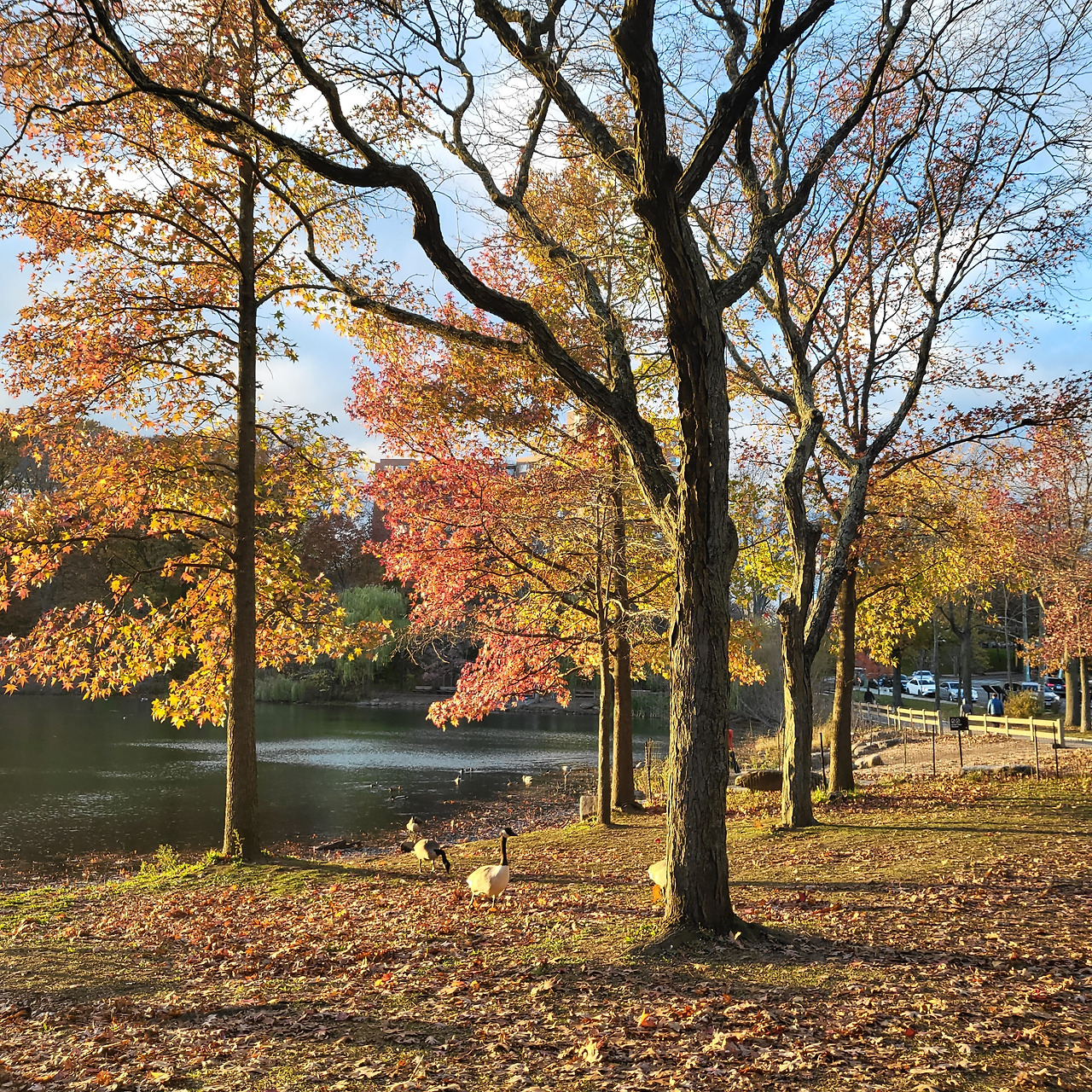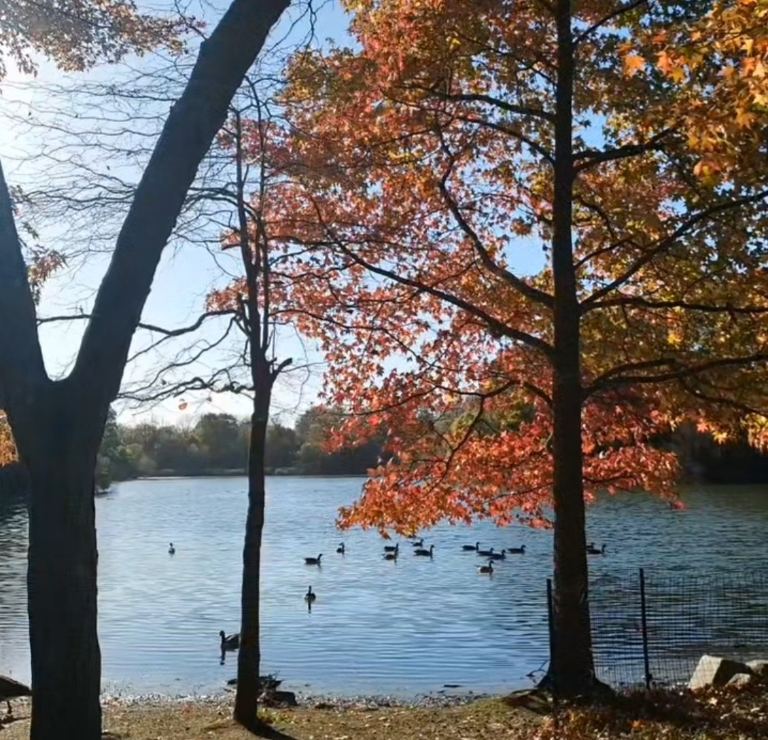 차로 5분쯤 달려 공원 입구에 차를 세우고 신선한 공기를 마시기 위한 심호흡을 한 후 호수 산책로로 들어간다. 들어가자마자 보이는 우뚝 선 나무들은 사계절의 다름을 오롯이 느끼게 해 준다. 봄에는 연두 잎들이 설레는 모습을 보이고, 여름에는 신록이 우거져 있어 시원한 그늘을 만들어 주니 좋다. 지금은 가을이어서 휑한 나무 사이에 떨어져 있는 나뭇잎들로 가득하다. 대학 시절의 늦가을 추억이 생각나는 낙엽 타는 냄새를 맡고 사그락거리는 소리를 즐기며 호수 산책길을 향해 걸어간다.