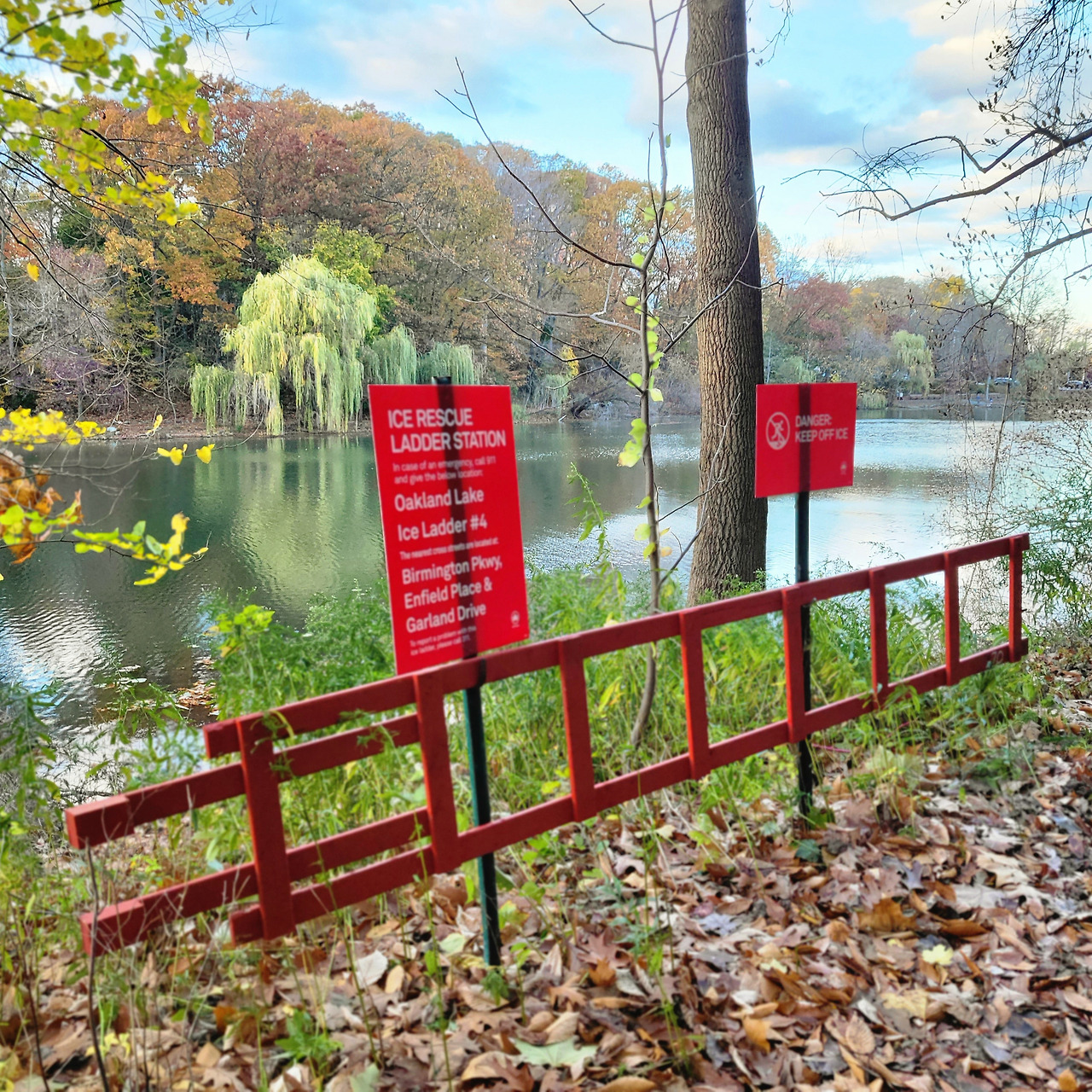 호수의 중앙을 지나면 빨간 사다리로 만든 "산책 시 주의 사항"을 적어놓은 사인 판이 보인다. 겨울에 얼음이 얼었을 때 낙상사고를 염려한 알림판인데 볼 때마다 참 센스 있다는 생각이 든다. 나무로 만든 사다리 모양이 주위의 자연과 어우러지고 빨간색이어서 집중이 잘 되고 활력도 느껴진다.